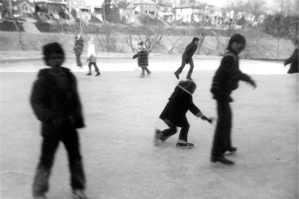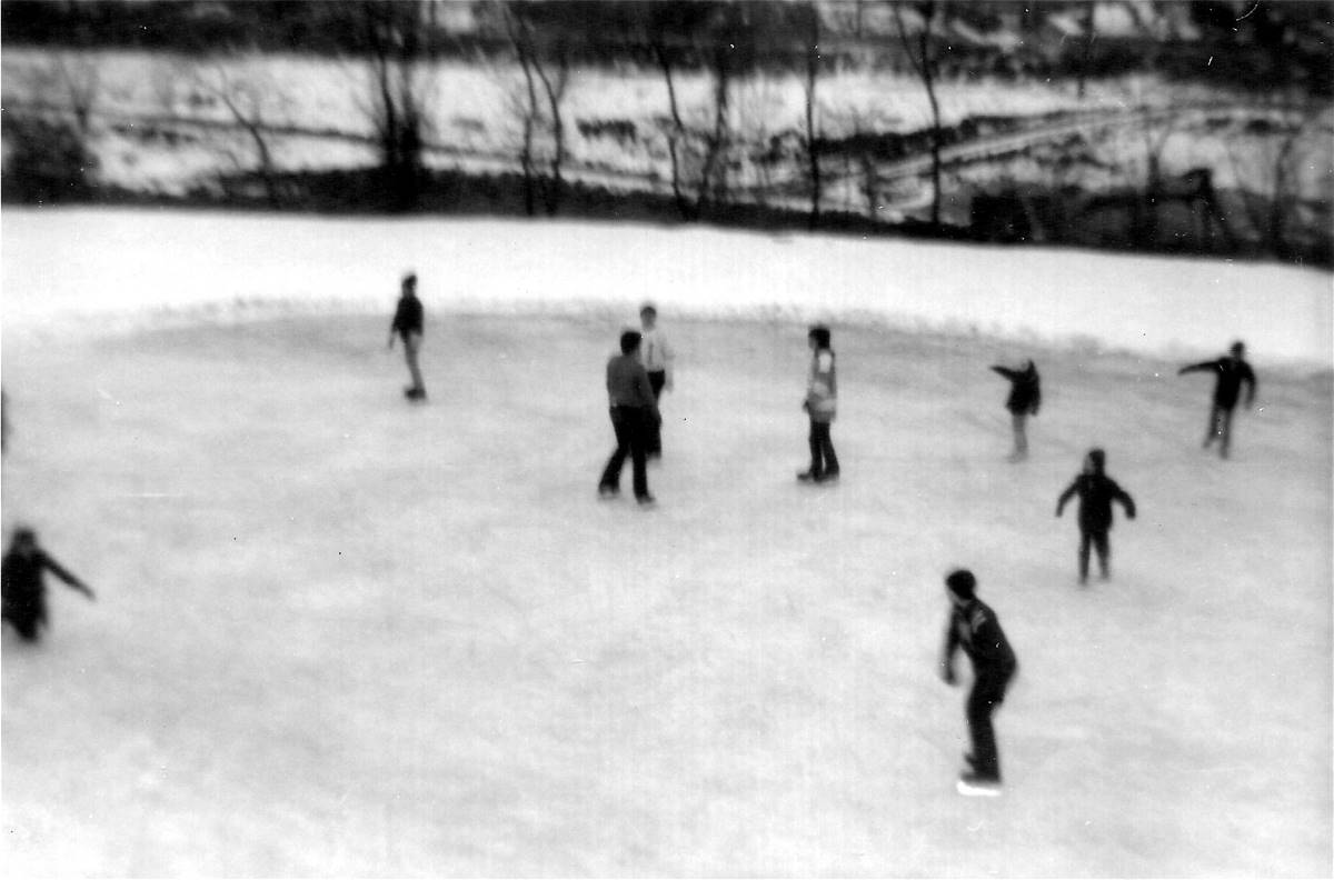 For the first couple years, Director Chuck Senft set up an ice skating rink behind the new Recreation Center. It was located where the present-day playground stands, and was a popular attraction, as long as it remained frozen. The downstairs room in the Recreation Building was built of decorative brick, with a working fireplace and a full kitchen for serving refreshments. It was called the Warming Hut, designed with crowds of ice skaters in mind. An accomplished veteran in creating and maintaining an ice skating rink from his many years at Moore Park, Director Chuck Senft diligently went about the task of creating a sheet of ice whenever the temperature dropped below freezing. Kids and adults alike were delighted. The ice skating rink was available for only two skating seasons, the grounds eventually occupied with permanent playground equipment. Chuck always said that he gave up after two years of frustration, the angle of the sun persistently melting the ice he worked so hard to lay down. These photos are from Chuck's collection, showing the rink in 1972 and 1973. |