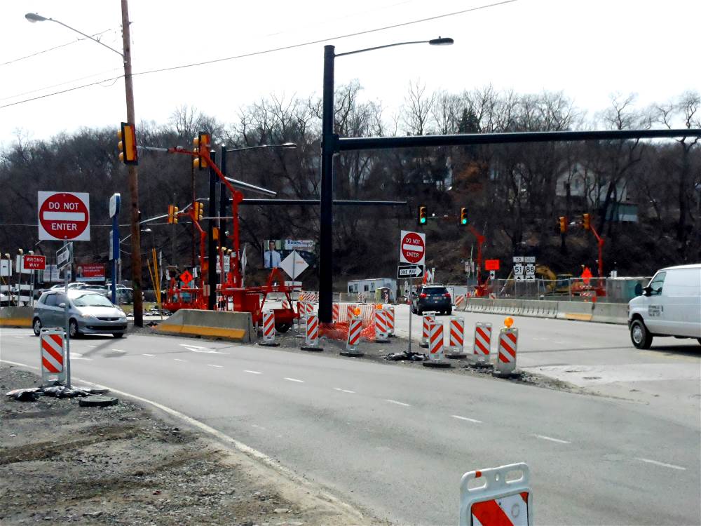 completed: A Welcome Relief After twenty years of preparation, the Route 51/Route 88 intersection is finally getting a necessary makeover. Built in 1929, this is the first comprehensive work ever done on this busy intersection. The bridge network is, after over eighty years of continual use, literally crumbling. Poor water flow has led to increased flooding during heavy rain. To have waited any longer to implement these improvements would have been inviting disaster. It is hoped that when construction is over the new design will be a welcome relief for motorists, an upgrade as beneficial as the recently completed Liberty Tunnel and West End Interchange Improvements. Construction Photos - March 16, 2015 * Photos and information