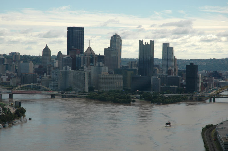 Click on images for larger photos This is the city of Pittsburgh on September 19, 2004, shortly after Hurricane Ivan dumped a record 5.95 inches of rain on the Pittsburgh region. The unprecedented record rainfall amount came only weeks after Hurricane Francis dumped a record 3.60 inches. With Ivan following so soon after Francis, the extreme saturation of the terrain left the water with nowhere to go, and widespread flooding occured both in the city proper and the nearby communities.