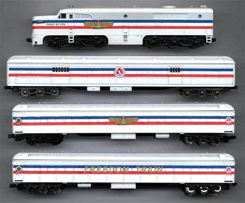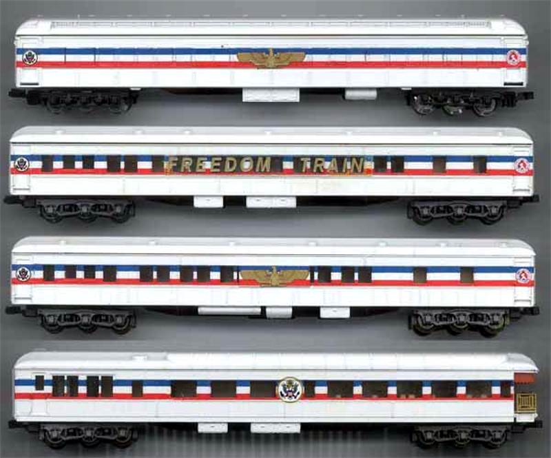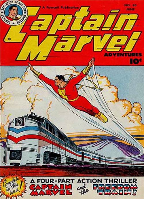 Freedom Train Collectables The original Freedom Train was immortalized in a June 1, 1948 edition of the Captain Marvel comic book (Issue #85). The action thriller featured a four-part adventure. Part 1 was entitled "The Freedom Train Rolls On," followed by "The Chase Through History," "The Heritage Of America" and "The Freedom Plane." In the comic book adventure, the evil, time-traveling scientist Sivana ventures back through American history to destroy the documents of liberty the Freedom Train will one day carry. Captain Marvel rises to the challenge and foils Sivana's plan. The Freedom Train edition is one of the most sought after issues in the Captain Marvel collection. <><><><> <><><><> <><><><> <><><><> <><><><> <><><><> To commemorate the Freedom Trains, Lionel created sets that are now some of their most highly collectable packages. The 1948 Freedom Train set contains replicas of the diesel locomotive and all seven cars. The 1976 American Freedom Train collection, in HO guage, contains all twenty-six cars and replicas of each steam locomotive used during the tour. |