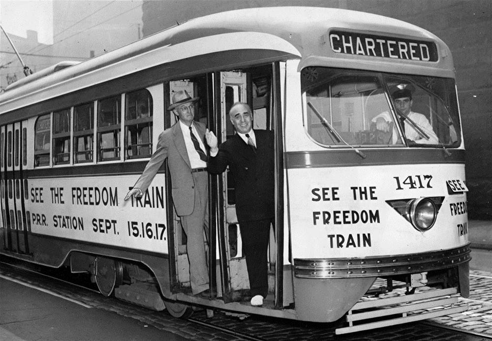 The United States of America has seen two national "Freedom Trains" in its history. The first train traveled the continental United States after World War II, from 1947 to 1949. The second train traveled the country during the Bicentennial Celebration, from 1975 to 1976. Both Freedom Trains made a stop in Pittsburgh, Pennsylvania. Celebrating Our Rights, Responsibilities And Freedoms Shortly after World War II, William Coblenz, an assistant director in the Department of Justice, toured the National Archives. He viewed the many national historic exhibits. These included the latest editions to the collection, the German surrender documents and Adolf Hitler's last will and testament. Moved by what he saw, Coblenz felt that many of these exhibits, which document the country's heritage of freedom and the sacrifices made over the years to preserve it, should be made available to the masses, many of whom would never get to visit the National Archives. He came up with the concept of a traveling exhibit that included many of the Archive's priceless treasures. The idea was passed on to Solon Buck, Archivist of the United States, who in turn brought it to the attention of Attorney General Tom Clark. Attorney General Clark felt that only a year after the conclusion of the World War, Americans had already become complacent about their rights and responsibilities as citizens, and the value of their many freedoms. He proposed the idea of a "Freedom Train" to President Harry S. Truman on May 22, 1947, and received the President's "strongest endorsement." The Freedom Train was envisioned to include both dozens of documents celebrating American liberty along with an equal number of documents illustrating tyranny and despotism. It was hoped that viewing these exhibits would cause a reawakening in the hearts of Americans and serve as a reminder that freedom can not be taken for granted. A Seven-Car Traveling Exhibit The American Heritage Foundation oversaw the financial and operational affairs of the exhibit. The project was funded by a number of corporate, private and government contributions. The train itself would consist of a new 2000 horsepower diesel-electric locomotive, called the "Spirit of 1776," and seven cars. There was a baggage car, three exhibit cars, and three Pullman cars to accomodate the forty-one member staff. The train was initially called the "Liberty Train." After some deliberation, it was decided that it would only carry objects related to our American liberties. Before the official launch of the exhibit, the name was changed to "Freedom Train." Included in the exhibit were such items as Thomas Jefferson's rough draft of the Declaration of Independence, the Bill of Rights, the Constitution, the Emancipation Proclamation, the Gettysburg Address, the Iwo Jima flag, the German and Japanese surrender documents, and the original Magna Carta, written in 1215. Also displayed were Caesar Rodney's letter, written on July 4, 1776, describing the voting on the Declaration of Independence, and George Washington's letter to Congress outlining the hardships his troops suffered at Valley Forge. Altogether, there were 126 items on display. Guarding the Freedom Train were a select group of twenty-nine United States Marines, many of whom had seen combat in World War II. The Marines stood their post adorned in their finest dress blues. Colonel Robert F. Scott was named Commanding Officer of the Guard. The Freedom Train And President Truman Come To Pittsburgh The Freedom Train began its nationwide journey from Philadelphia on September 17, 1947, which was the 160th anniversary of the signing of the United States Constitution. The train traveled the country for a year before its route brought it to Western Pennsylvania.