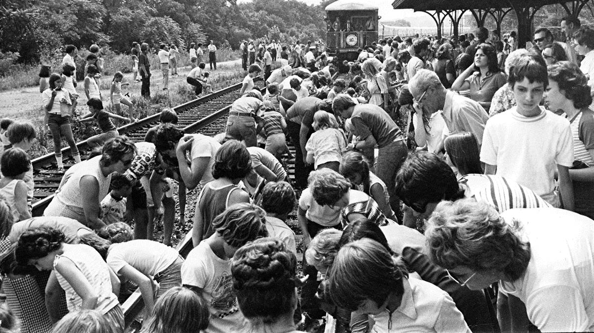 Rowland and several of his partners from prior steam-powered excursion trains knew that the steam locomotive was a proven "people magnet." They believed that a train using vintage motive power would draw the crowds, and that an exhibit featuring historic national documents and artifacts would do wonders in restoring the Spirit of America. With the backing of five corporate sponsors, Rowland organized a second Freedom Train and set off to prove that national pride was alive and well in the United States of America. A Traveling Bicentennial Celebration The new American Freedom Train would consist of twelve display cars. Ten of these would be walk-through displays and the other two would hold large objects that could be viewed from the outside through large showcase windows. A total of twenty-six cars would make up the train, which would be pulled by one of four separate steam locomotives, all specially restored for the occasion. On board were a collection of five hundred precious treasures of Americana, including the original Louisiana Purchase documents, Benjamin Franklin's handwritten draft of the Articles of Confederation, Judy Garland's dress from The Wizard of Oz, Joe Frazier's boxing trunks, Martin Luther King's pulpit and robes, Jesse Owens' four gold medals and even a rock from the moon. Also included were many of the same historic documents that were part of the 1948 Freedom Train exhibit. The American Freedom Train Arrives In Pittsburgh The train was inaugurated by President Gerald Ford in Alexandria, Virginia on December 19, 1974. Four months later, when all preparations had been made, the train began it's cross-country journey. The first stop on the 140-city nationwide tour was in Wilmington, Delaware. A sellout crowd of 40,000 was onhand for the opening ceremony on April 1, 1975.