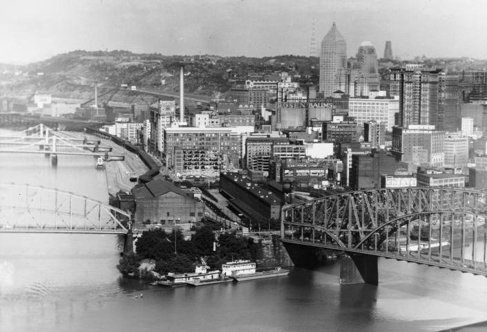 This view of the Point area taken in 1950 shows the Point Bridge, the Pennsylvania Railroad Freight Yards and the warehouses that take up most of the land where Point State Park lies today. Soon, Renaissance I will take place, and all of these structures will be razed to make way for Pittsburgh's first phase of city redevelopment. These efforts were led by Mayor David L. Lawrence. Note the warehouse on the Allegheny riverfront being dismantled. A color picture of the Point in 1950 showing the old Freight Yards and other structures before their demolition. Note the Steamboat Cafe on the Monongahela riverfront near the bridge. This became a popular eating place during the construction of Point State Park during the decade to come. The photo below shows much the same view in black and white.