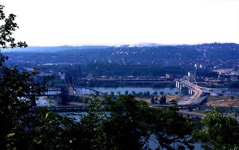 Pittsburgh's Point in 1965, nine years before completion of the Point State Park project. Much work remains to be done. The Manchester and Point Bridges, at the near point, will stand for another five years and work on the crosstown connection between the Fort Pitt and Fort Duquesne Bridges continues. An interesting feature is the Fort Duquesne Bridge, center right in the photo. Although the bridge was completed in 1963, there are no ramps connecting it to the north shore. It remained this way until 1969, when construction of Three Rivers Stadium was underway. During this six-year period the Fort Duquesne Bridge was refered to as "The Bridge To Nowhere." * Photo contributed by Joseph Brendel * |