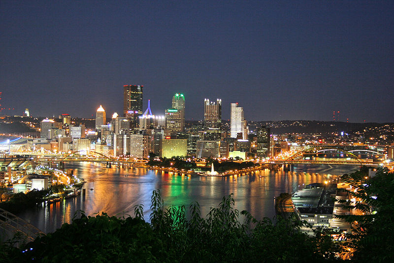 Pittsburgh's Golden Triangle in January 2006. The city lies under a blanket of snow and the buildings glisten a sunny winter day. The Christmas tree still stands tall near the fountain in Point State Park. This photo was taken in August 2006. The city glows on a summer evening. A bird's eye view of I-579 coming into town from the north side and branching off in different directions around the Golden Triangle. The City of Pittsburgh