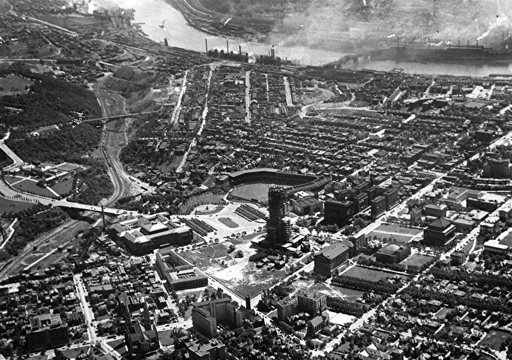 An old aerial view from the early-1960s, showing the University of Pittsburgh campus with an excellent view of landmarks such as the Student Union building, the dormitories, Soldiers and Sailors Memorial Hall, Presbyterian Hospital and Pitt Stadium. The school was chartered as the Pittsburgh Academy in 1787, on the North Side in Allegheny City. It is one of the oldest institutions of higher education in the country. In 1819 the school became the Western University of Pennsylvania. The University remained in Allegheny City on the north shore for the next ninety years.