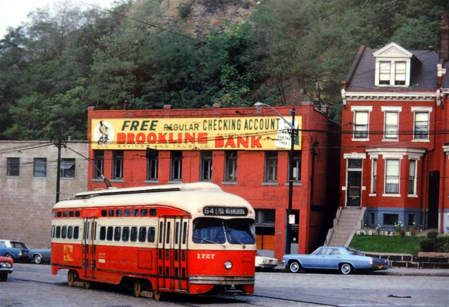 Independance Day 1954 On July 4, 1954, Brookline held the annual Independance Day Parade. In the photo below, Scouts from Troop #6 and Pack #601 pass the intersection with Flatbush Avenue, followed by a procession of vehicles. The Brookline Savings and Trust building, with its cream-colored granite facade, stands a bit further down the boulevard near Stebbins Avenue. Two Iconic Symbols Of Brookline's Past Two trolley cars, one inbound and one outbound, pass near Flatbush Avenue along Brookline Boulevard in 1965. The Brookline Savings and Trust building stands to the right. Streetcar service in Brookline came to an end in September 1966. The Brookline Savings and Trust Company followed in 1969. Within a span of three years, two of the iconic symbols of Brookline were relegated to history. Some Memorabilia From The Brookline Savings And Trust Old Pittsburgh Press