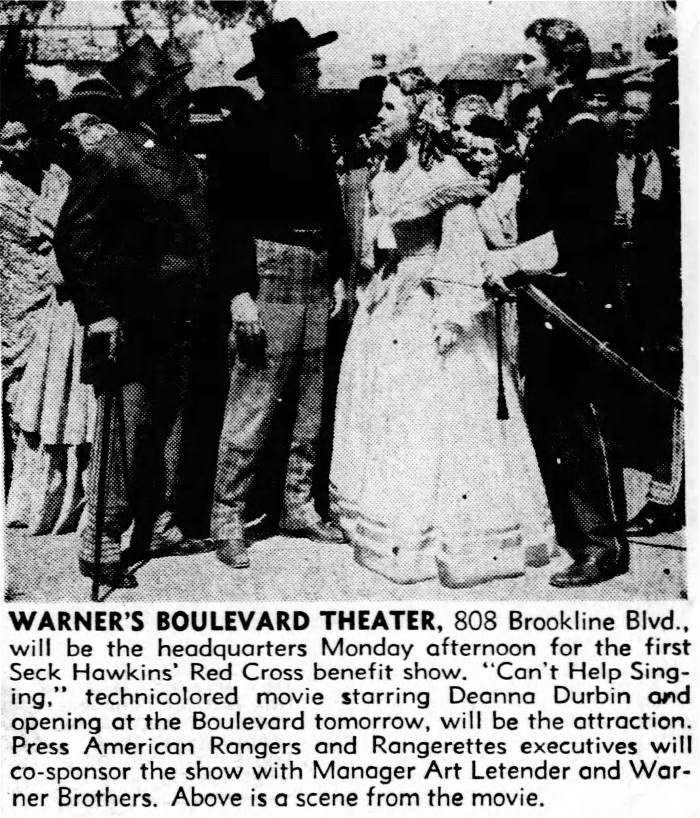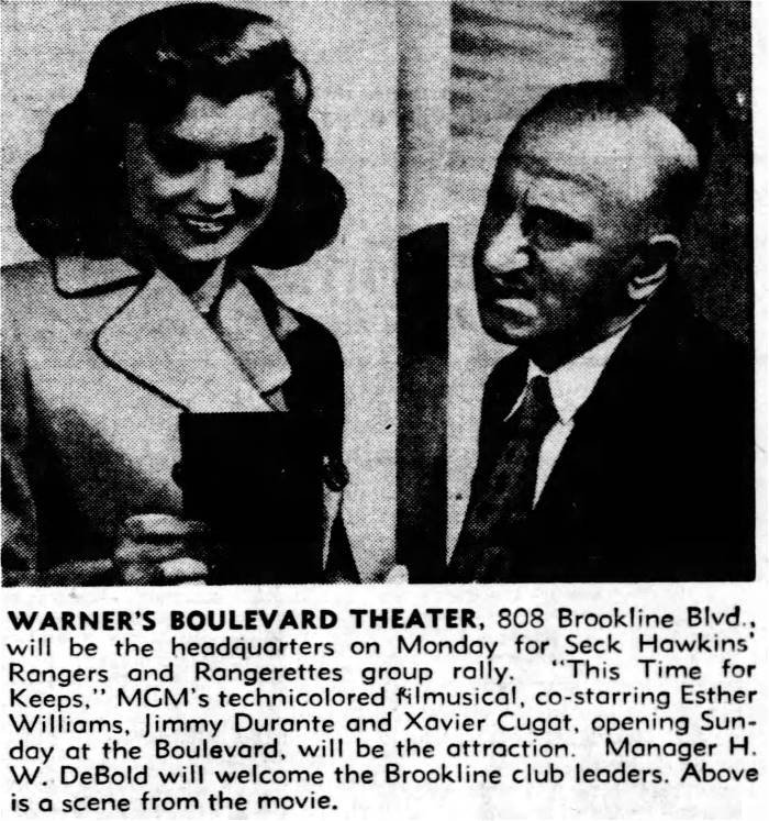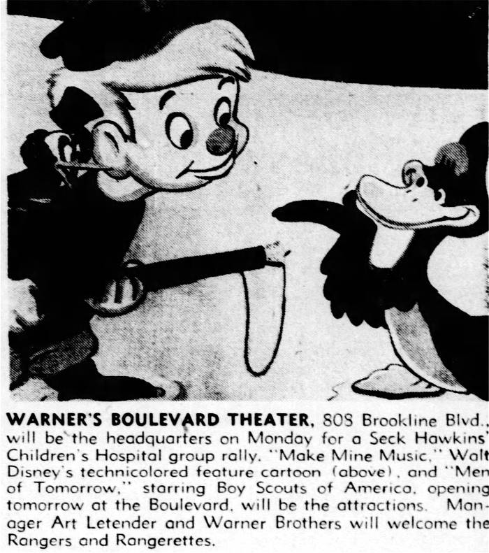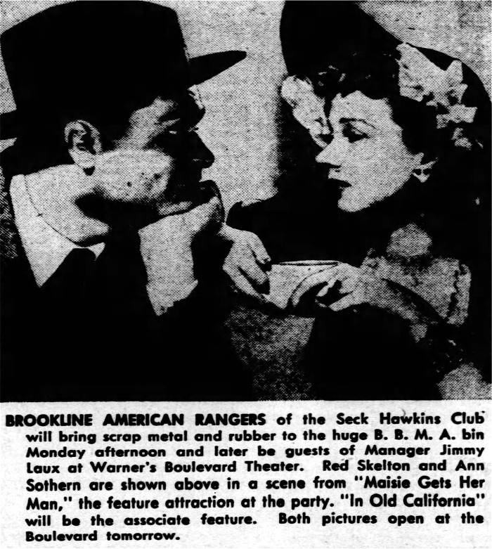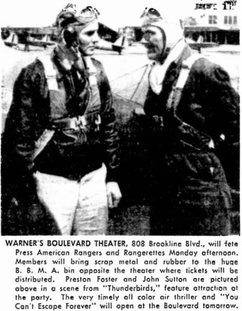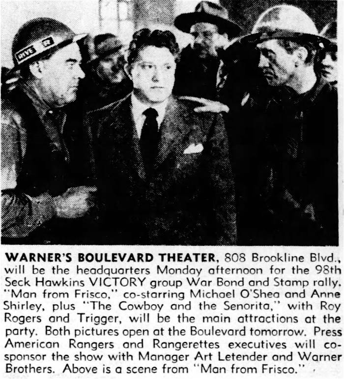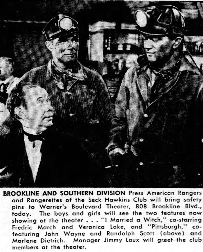 <><><><> <><><><> Seckatary Hawkins Club Another South Hills group that frequented the Boulevard Theatre was the Seckatary Hawkins Fair And Square Club. Formed in 1918 and based upon a set of novels, short stories and cartoon strips by Robert Schulkers, the Seck Hawkins Club was quite popular among children in Pittsburgh. Members were referred to as Rangers and Rangerettes. The Pittsburgh Press was one of the national newspapers who carried the Seckatary Hawkins cartoon strip and helped sponsor local Seck Clubs. The newspaper employed an actor, Ed Ritenbaugh, who played "Seck" from 1930 through 1950. Ritenbaugh would host five parties and movie outings for Seck Hawkins Club members in Pittsburgh theatres every week. Many of these gatherings were held at the Boulevard Theatre. During World War II, the Rangers and Rangerettes of the Seck Hawkins Club were involved in scrap metal collection, defense stamp drives and Victory Garden rallies throughout the city. Many of these rallies were held in Brookline, and manager Jimmy Laux of the Boulevard Theater often hosted the events, with all children gaining free admittance to see a feature film. Club members were encouraged to bring a few pounds of scrap metal, or to sell defense stamps to cover their admittance to the shows. This photo appeared in the October 7, 1942 Pittsburgh Press. The caption read: AMERICAN RANGERS AND RANGERETTES of the Press Seck Hawkins Club in the Brookline District brought scrap metal and rubber to the huge Brookline Business Men's Association bin on Brookline Boulevard. Later in the day the boys and girls were guests of Manager Jimmy Laux at the Boulevard Theater. Director-Secretary Barbara Blakely of 961 Fordham Avenue, district leader, is shown at the right. Seck Hawkins chapters everywhere are out to bring in thousands of tons of scrap metal and rubber to help Uncle Sam. The group would meet at the Brookline firehouse, then parade down the boulevard to the theatre, oftentimes with a band leading the way. The program was a huge success, and the events at the Boulevard Theatre consistently ranked as some of the city's biggest contributors to the ongoing defense drive. After the war, the club continued to host events around the city, including at the Boulevard Theatre. The club's charitable focus switched from supporting the defense effort to helping various Child Welfare organizations. <><><><> <><><><>
