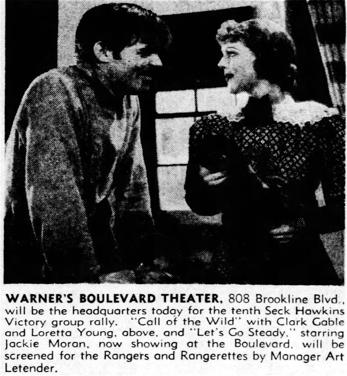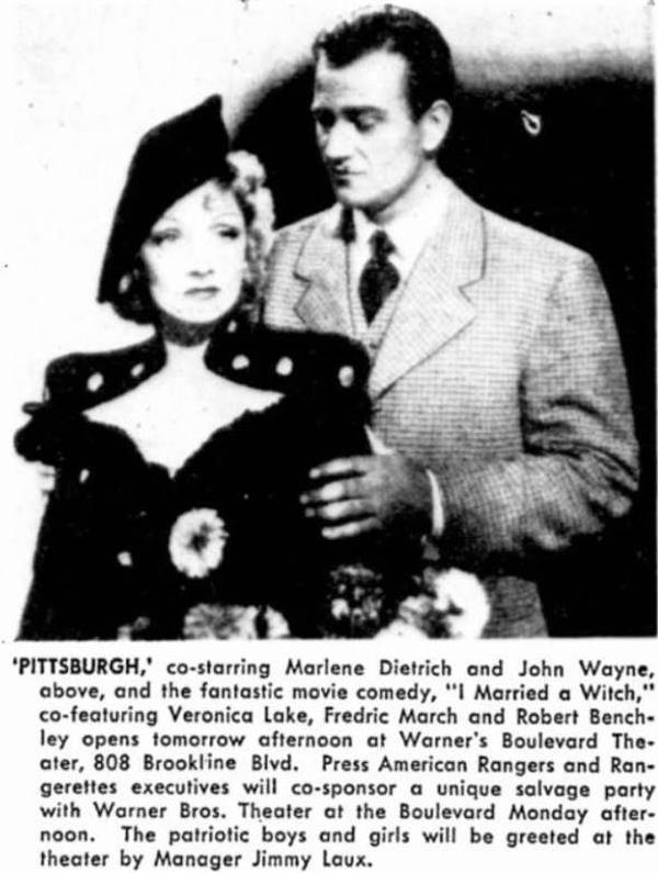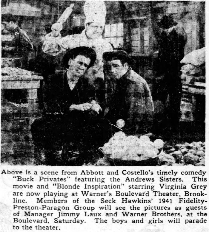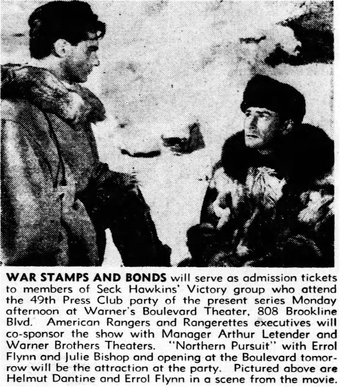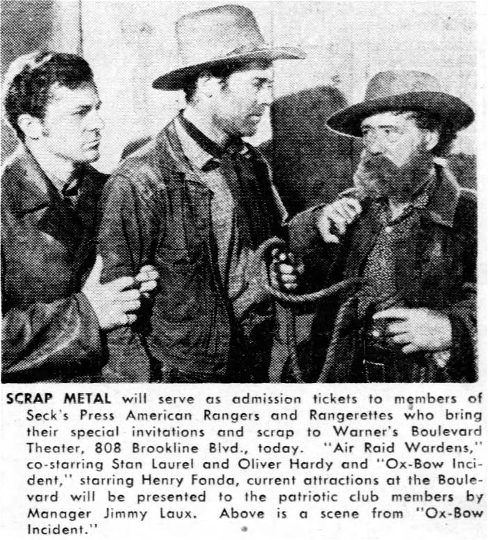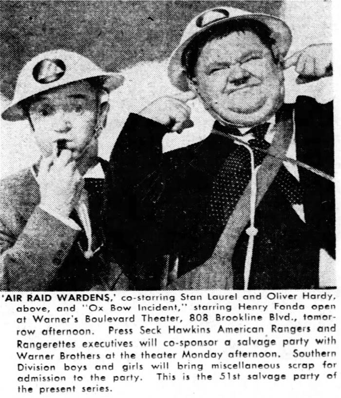 <><><><> <><><><> Seckatary Hawkins Club Another South Hills group that frequented the Boulevard Theatre was the Seckatary Hawkins Fair And Square Club. Formed in 1918 and based upon a set of novels, short stories and cartoon strips by Robert Schulkers, the Seck Hawkins Club was quite popular among children in Pittsburgh. Members were referred to as Rangers and Rangerettes. The Pittsburgh Press was one of the national newspapers who carried the Seckatary Hawkins cartoon strip and helped sponsor local Seck Clubs. The newspaper employed an actor, Ed Ritenbaugh, who played "Seck" from 1930 through 1950. Ritenbaugh would host five parties and movie outings for Seck Hawkins Club members in Pittsburgh theatres every week. Many of these gatherings were held at the Boulevard Theatre. During World War II, the Rangers and Rangerettes of the Seck Hawkins Club were involved in scrap metal collection, defense stamp drives and Victory Garden rallies throughout the city. Many of these rallies were held in Brookline, and manager Jimmy Laux of the Boulevard Theater often hosted the events, with all children gaining free admittance to see a feature film. Club members were encouraged to bring a few pounds of scrap metal, or to sell defense stamps to cover their admittance to the shows. This photo appeared in the October 7, 1942 Pittsburgh Press. The caption read: AMERICAN RANGERS AND RANGERETTES of the Press Seck Hawkins Club in the Brookline District brought scrap metal and rubber to the huge Brookline Business Men's Association bin on Brookline Boulevard. Later in the day the boys and girls were guests of Manager Jimmy Laux at the Boulevard Theater. Director-Secretary Barbara Blakely of 961 Fordham Avenue, district leader, is shown at the right. Seck Hawkins chapters everywhere are out to bring in thousands of tons of scrap metal and rubber to help Uncle Sam. The group would meet at the Brookline firehouse, then parade down the boulevard to the theatre, oftentimes with a band leading the way. The program was a huge success, and the events at the Boulevard Theatre consistently ranked as some of the city's biggest contributors to the ongoing defense drive. After the war, the club continued to host events around the city, including at the Boulevard Theatre. The club's charitable focus switched from supporting the defense effort to helping various Child Welfare organizations. <><><><> <><><><>