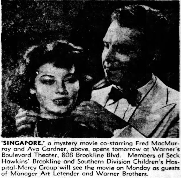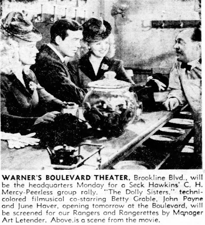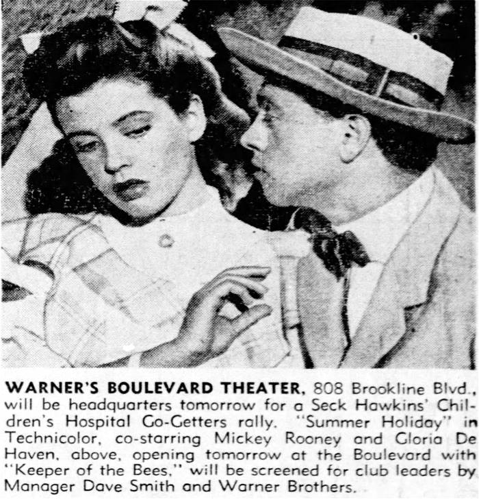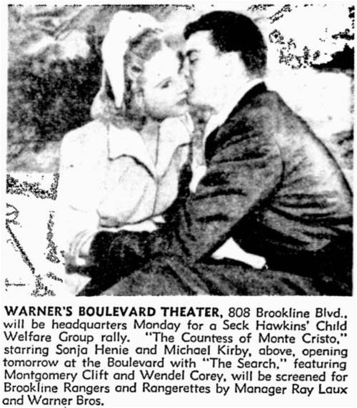 <><><><> <><><><> Fond Memories of the Boulevard Theatre The Boulevard Theatre was a big part of the lives of many children and teenagers in Brookline. Fred Proie reminisced about one hot summer day: "I remember my girlfriend and I taking the long walk to the Brookline News Stand, where they displayed a sign outside, saying the store was "air-conditioned". We'd walk in there just to get cool." "Sundays was always the day to go to the afternoon movies. We'd save fifteen cents just for that occasion, buying a five cent candy bar at the corner drugstore first, so that we could enjoy it during the movie." "I remember when a tax of one cent was put on the ten cent ticket fee. I'd spent five cents on the candy bar, and had only ten cents left. When I got in line, someone told me I needed eleven cents, so I ran all the way back home to Templeton Street and got the extra penny." <><><><> <><><><>