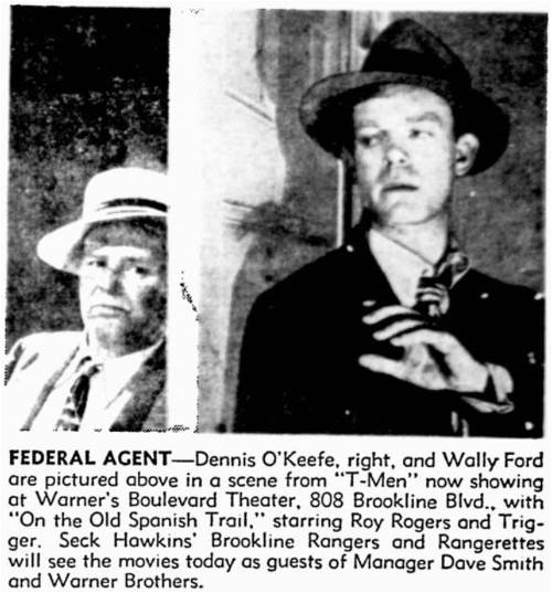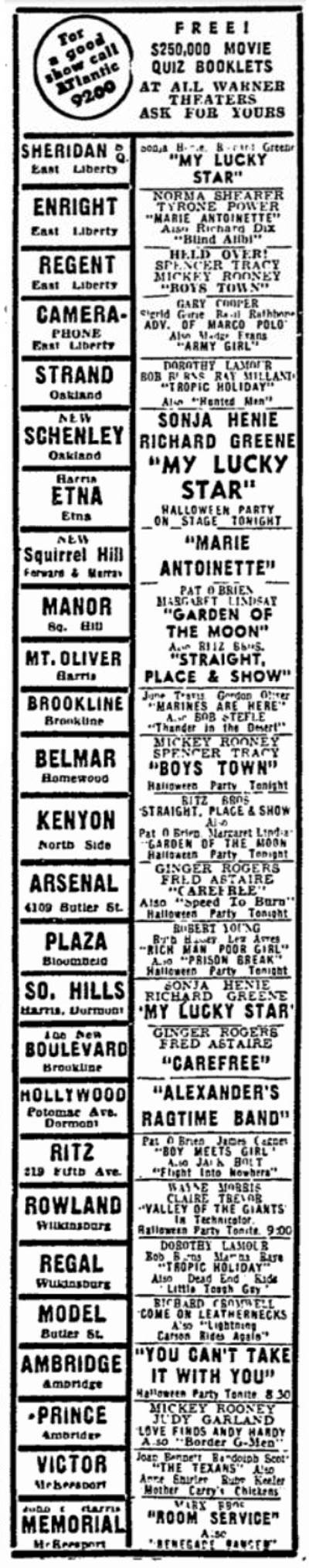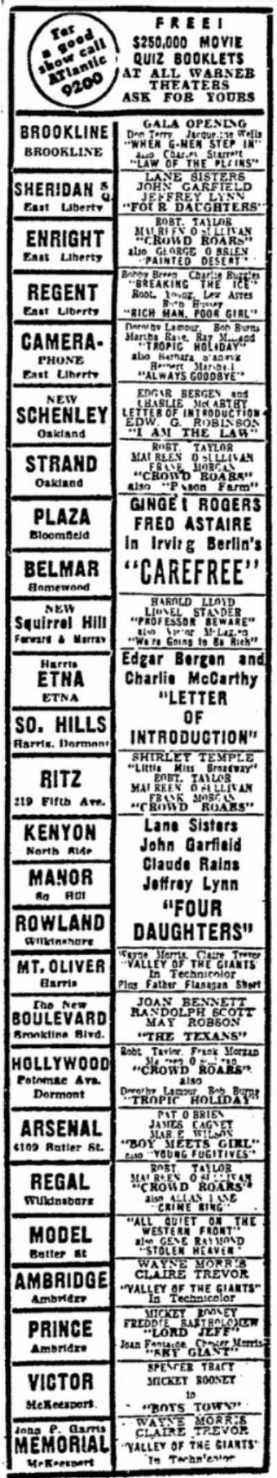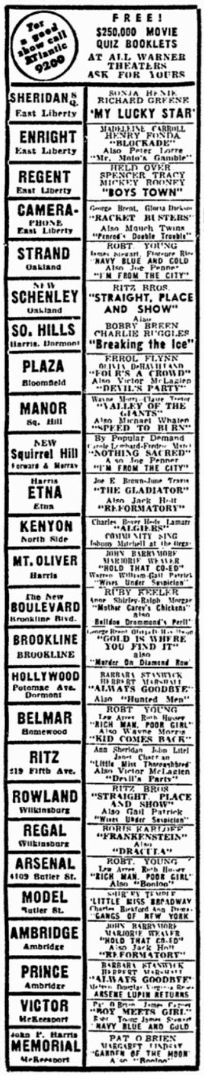 <><><><> <><><><> The Warner Brothers Years In 1938, the movie house was leased to Warner Brothers, who were establishing a large chain of neighborhood theatres in the Pittsburgh area. The theatre was upgraded with new sound equipment and projectors. On October 15, 1938, the new Brookline Theatre celebrated it's gala grand opening with a double feature. The movies shown that day were the recently-released action crime drama "When G-Men Step In," starring Don Terry, Julie Bishop, and Robert Paige, and the 1929 western classic "The Law Of The Plains," starring Tom Tyler. The Community of Brookline now had two Warner Brothers movie theatres along the boulevard, located only one block from each other. The Boulevard Theatre, at 808 Brookline Boulevard, had been in operation for almost a year, since November 10, 1937. Pittsburgh Press and Post-Gazette movie advertisements list showtimes for the Brookline Theatre, along with the neighborhing Boulevard Theatre, from October 15 to November 3, 1938. After that timeframe, only the Boulevard Theatre is posted. All mention of the Brookline Theatre disappeared from print. On March 9, 1939, the building was bought back by the German Beneficial Union, who took control of the banquet hall. Warner Brothers retained the lease to the theatre and the storefronts at the front of the building were leased to the Realty Rental and Sales Company (732) and to Ralph Lograss (734) for a barber shop. Warner Brothers then converted the theatre and storeroom into a screening room and distribution center. <><><><> <><><><>