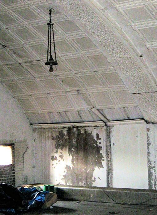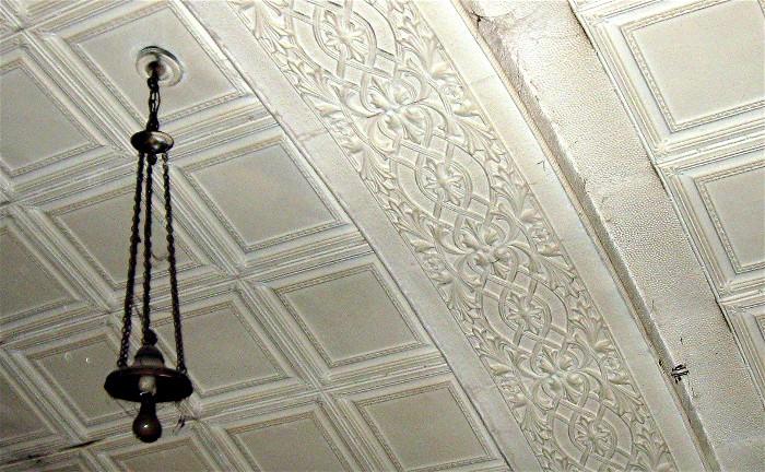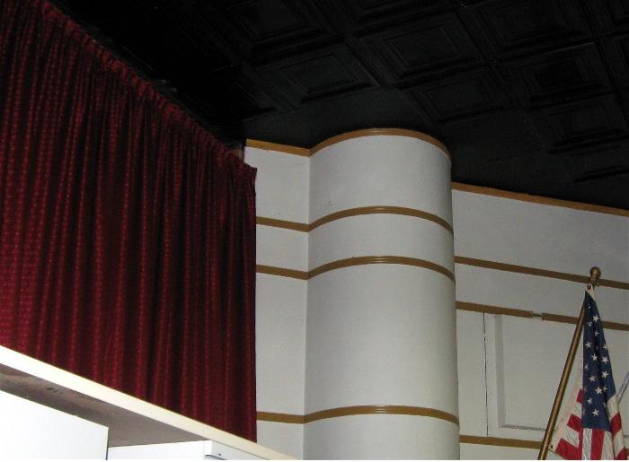 Like the other nearby Brookline moviehouse, the Brookline Theatre building still retains many reminders of it's past. The stage area is easily identifiable, with wall painted white for use as a movie screen. The decorative arched-tin ceiling and light fixtures are still in place, and the projection room is still there. The equipment has long since been removed.
