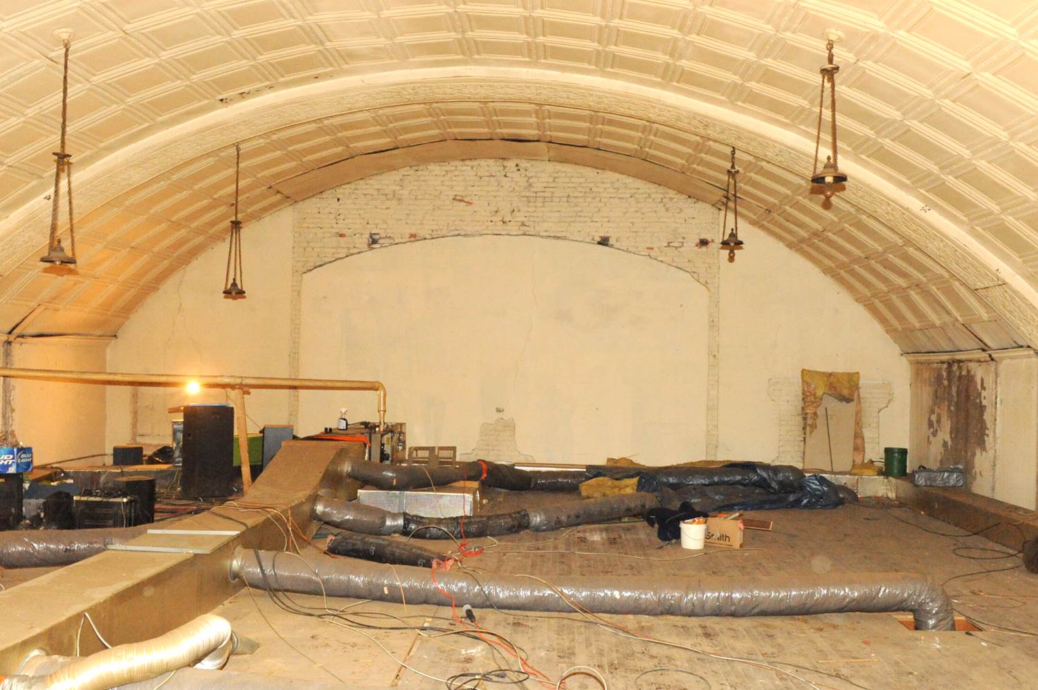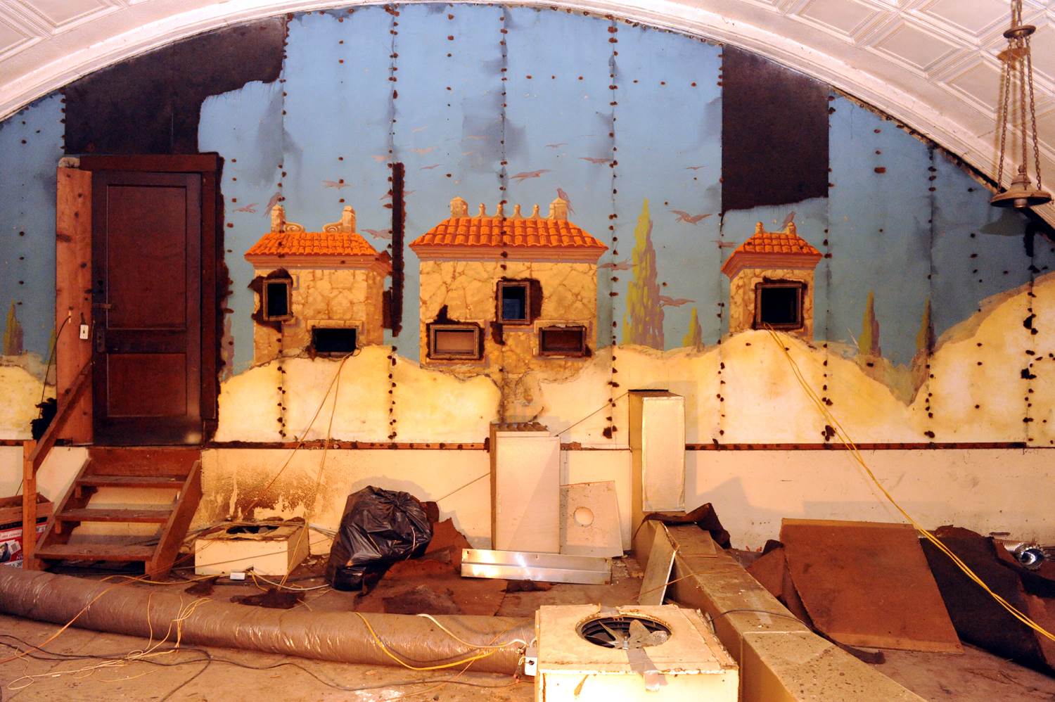 <><><><> <><><><> Uncovering the Past When the theatre was remodeled by Warner Brothers in 1938, a dark burlap-type material was placed over the rear wall to improve the sound quality in the hall. Along the wall were several openings for stage lighting and projector openings. This burlap covering remained in place for the next seventy-seven years.