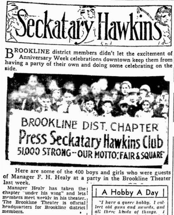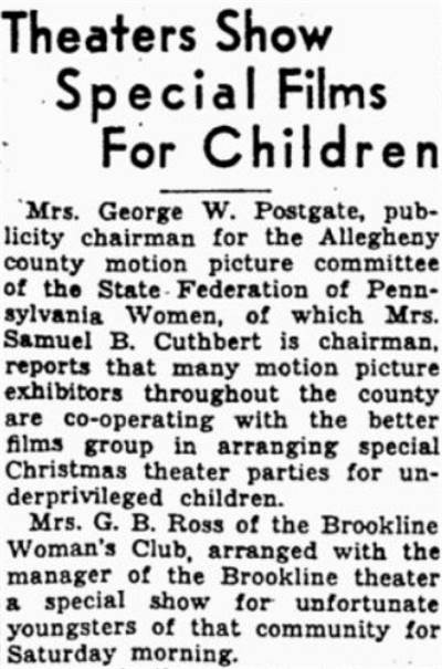 On March 31, 1926, The German Beneficial Union sold the building to Anton Hajek, who five months later sold it to Jacob Altman. On October 26, 1927 the building traded hands again, this time sold to Kaufman Realty, who retained control of the theatre for the next eleven years. During this time, the theatre and banquet hall became the original headquarters of the Brookline Chapter of the Pittsburgh Press Seckatary Hawkins Club, part of a nationally renowned children's organization. The Club sponsored movie outings at local theatres that raised funds for Child Welfare groups throughout the area. The Press clipping shown below was published in November 1931. The Seckatary Hawkins Club met at the Brookline Theatre weekly until November 1937, when they moved their local headquarters to Warner Brothers new Boulevard Theatre, located a short distance away along the 800-block of Brookline Boulevard. On May 10, 1935, the Brookline American Legion Post#540 moved their headquarters to the theatre banquet hall, where it remained until 1940. The building was also used by other community organizations like the Women's Civic Club, Brookline Boosters Association and the Roosevelt Club of Brookline for social gatherings and movie screenings. The newspaper clipping below, from December 23, 1935, shows how the Women's Civic Club and the Brookline Theatre manager arranged free admittance to underprivileged kids during that Christmas season. <><><><> <><><><>