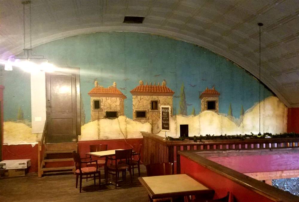 An interesting discovery was made in February 2015. While examing the back wall of the theatre, the shop owners noticed something painted behind the wall covering. When the burlap material was removed, it exposed a long-forgotten decorative mural.