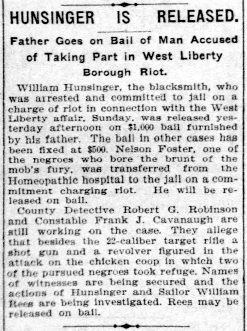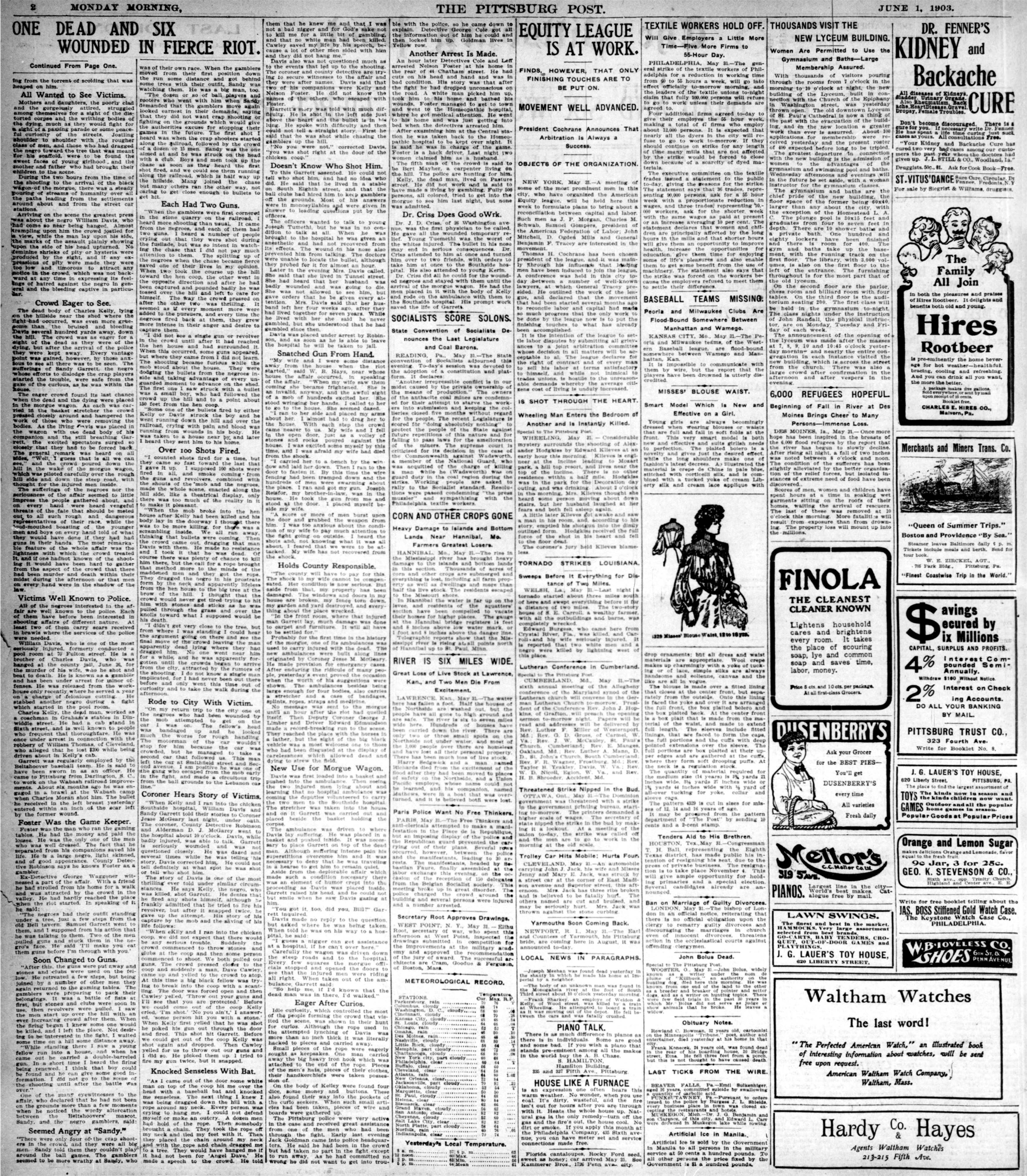 Pittsburg Press - June 1, 1903 Pittsburg Daily Post - June 1, 1903 Pittsburg Press - June 1, 1903 * Article Reprinted Below * <><><><> <><><><> <><><><> <><><><> <><><><> <><><><> Pittsburg Press - June 1, 1903 RIOTERS TO BE BROUGHT TO JUSTICE County Officials Investigating Sunday OFFICERS ARE SECURING EVIDENCE District Attorney John C. Haymaker and County Detective Robert G. Robinson today commenced an official investigation of the riot and murder at West Liberty Borough yesterday afternoon. A number of the prominent residents of the vicinity of the battle and the local officials have been sent for, and they will be asked for full information as to the terrible affray and all the incidents leading up to it. Officers have already been placed at work to secure evidence, and many arrests are expected soon. All the wounded whose injuries are prima facia evidence that they took part in the battle, are practically under arrest now, and it is but a matter of time until the issuing of a large number of warrants is commenced. The bloody outcome of the Sunday gambling and ball playing will also stir the county officials to vigorous action in the matter of putting an end to this form of Sunday law-breaking, and a general cleaning out of places that have been popular Sunday resorts is expected. Inspector Kelly left the South Side police station early this morning for the purpose of trying to effect the arrest of some of the colored gamblers engaged in yesterday's affair. He had received word that one of the colored men who had been hurt with a bullet had been located behind Mt. Washington, and he went to investigate. The police patrolling the South Side and neighoring districts were notified to arrest all colored people who might be acting suspiciously. During the morning, however, no additional arrests had been made. Justice of the Peace Mulholland, of West Liberty, has taken the matter up and has announced that he will have arrested every gambler, as well as all alleged to be connected with any of these disorderly gangs. In this he stated this morning he will be assisted by the people of his borough, as well as those of neighboring districts. The exact result of the race riot and attempted lynching will not be known for some days. The body of the one negro shot down by the frenzied mob when he was fighting at bay in a chicken house, which had been fired to smoke him and his companion out, will probably not be the only one to go to the morgue as the result of the battle, for four other victims of the affray have not passed the danger line at the hospitals. One of the negroes who was at first able to walk away from the scene is now known to have a fractured skull and may die, while the other two negroes and two white youths are hovering between life and death. The dead man was: The worst wounded are: The seriously wounded are: Others who were injured and suffered as a result