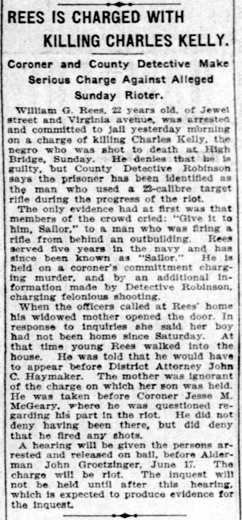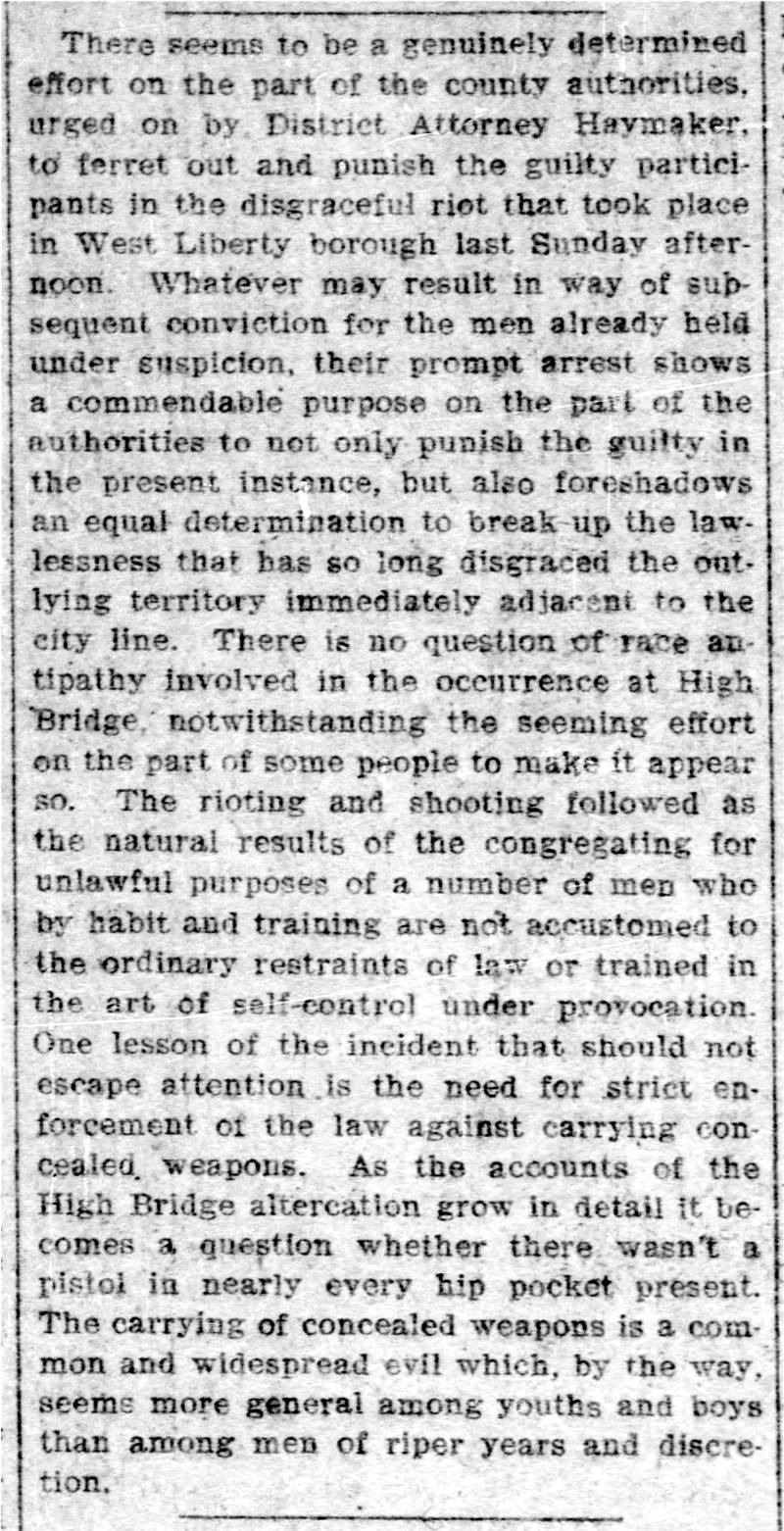 of the riot were: The battle which resulted in the death of Charles Kelly, colored, the attempted lynching of his companion, William Davis, and the wounding of at least twenty other persons, was probably as spectacular as any of the Southern lynching bees that have stirred up the country from time to time. There are many versions of how the trouble started, but all are similar from the beginning of the pursuit of the five negro gamblers who were chased by a mob of several hundred persons from the spot where they had been running a gambling game all afternoon. The gamblers have been in the habit of taking their stand some distance from the ball grounds in the hollow near High Bridge, West Liberty Borough, just beyond the Thirty-eighth Ward, and the ball players have tried to keep them from the neighborhood as they anticipated the police stopping the Sunday games if the gambling continued. Sunday, a week ago, the negroes left without putting up a fight, but yesterday, about three o'clock, when they were asked to leave they refused.