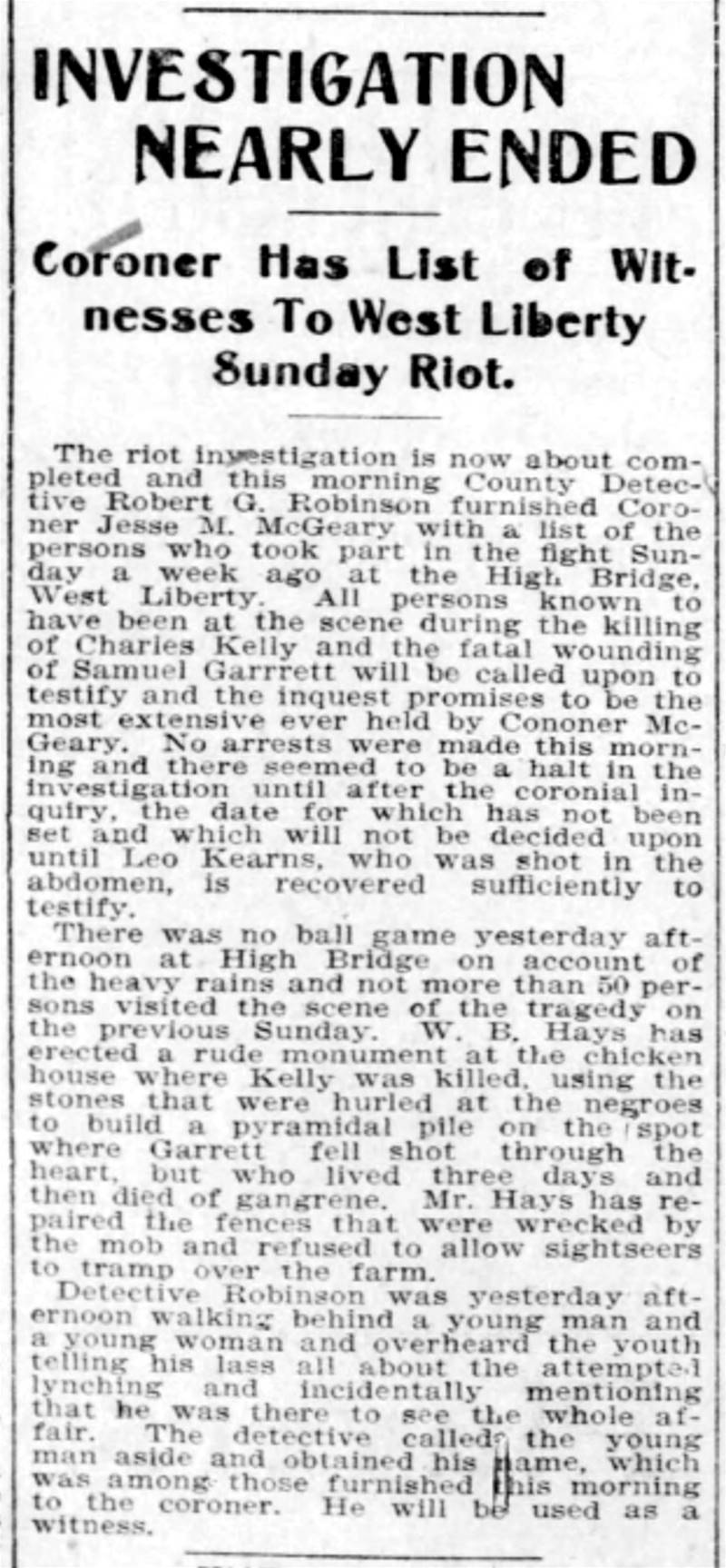 Pittsburg Press - June 1, 1903 Pittsburg Daily Post - June 2, 1903 Man With Rifle Says He Took It CONSTABLE IS THREATENED Wholesale arrests of ball players and spectators in the crowd of 2,000 at Sunday's riot in West Liberty Borough beyond the South Side will be made by the authorities at the insistance of District Attorney John C. Haymaker if witnesses persist in their silence regarding the participants in the rioting and bloodshed. The charge of murder will be made against all those who rushed upon the negro, Charles Kelly, killed at the chicken coop on Willian B. Hays' place. Attempted Murder will be charged against all who stoned and clubbed the negro, William Davis, dragging him from the coop with a rope around his neck and on the point of lynching him when "Angel Dave" Cawley's plea for mercy saved the man's life. When Constable John Patterson, of West Liberty Borough, appeared before Judge J. R. MacFarlane, in criminal court yesterday, to make his annual report on the preservation of order in his borough he declared that he had been threatened over the telephone that he would be killed if he interfered with the gambling at High Bridge. The court rebuked him, and commanded that he act regardless of alleged intimidation. HELD AS PRISONERS Aside from Nelson Foster, negro, who was taken to the Homeopathic Hospital, as reported yesterday, and others in the South Side hospital, to be held as witnesses upon their recovery, and John Golden, negro, who was sent to jail by Coroner McGeary as a witness, no other prisoners were held. County Detective Robinson went before Alderman John Groetzinger in the afternoon to have warrants issued for four players of the Beltzhoover ball team and spectators whose names had been obtained as witnesses of the rioting. "Angel Dave" Cawley, of McKean Street, and Frank Cunningham, of Brownsville Avenue, were examined by District Attorney Haymaker yesterday morning. Cawley told of his efforts to save the negro Davis from lynching. He said he asked Davis to give him his weapons, which the negro surrendered. Cawley brought the two revolvers and rifle into the district attorney's office. REISFAR IS RELEASED Constable Cavanaugh arrested William Reisfar, who lives in the house of W. B. Hays. Cawley identified Reisfar as the man he had seen with the rifle. Reisfar said that he had taken the gun from its resting place in the house, but added that three men rushed in and snatched the rifle from him. He testified that he had procured the gun to protect the house. District Attorney Haymaker considered that he was justified in doing this, and Riesfar was released. The inquest over Kelly will be held as soon as those in the hospital recover sufficiently to testify. At the South Side hospital last night it was said that Samuel Garrett, who was not expected to live through the night, is much improved and will recover. He was shot through the side and arm. Edward Reed, brother-in-law of W. B. Hays, said that he saw Davis, the negro who was almost lynched, shoot Garrett as the "mascot" led the rush upon the chicken coop. PROBING FOR THE BALL The third patient at the South Side hospital who was shot in the rioting, Joseph Tumetha, was reported last night as in a serious condition, but is expected to recover. The two others injured in the rioting were said to be recovering last night. "Borough officials are constantly sending to me when there are violations of the law which is their business to suppress," said District Attorney Haymaker last evening. "We cannot interfere with Sunday ball playing, which is for borough officials to suppress. We will suppress gambling wherever found. The sheriff will not go to High Bridge next Sunday to stop ball playing. He is sent only where there is an outbreak. The affair on Sunday was of that accidental sort which grew suddenly from lesser circumstance."