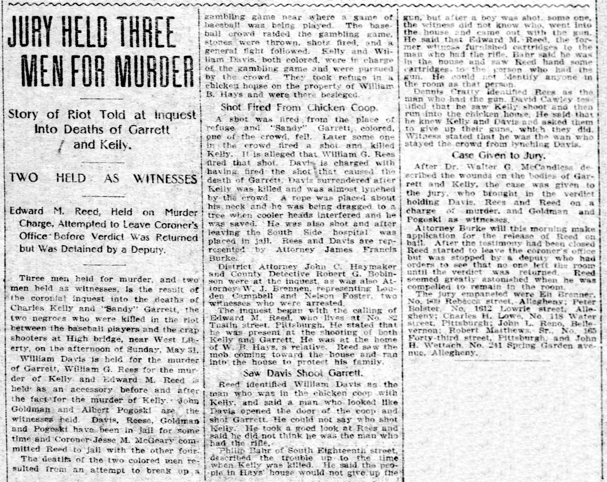 Pittsburg Press - June 5, 1903 Pittsburg Weekly Gazette - June 5, 1903 Pittsburg Daily Post - June 5, 1903 Pittsburg Daily Post - June 7, 1903 Pittsburg Daily Post - June 8, 1903 Pittsburg Press - June 8, 1903 Pittsburg Daily Post - June 25, 1903 * Article Reprinted Below * <><><><> <><><><> <><><><> <><><><> <><><><> <><><><> Pittsburg Daily Post - June 25, 1903 JURY ON RIOT FIXES BLAME REES TO FACE TRIAL ON CHARGE MANY ATTEND THE INQUEST Davis, Who Has Close Call, Is Charged THREE OTHERS ARE INVOLVED Responsibility for the deaths following the riots between negro gamblers and ball players at West Liberty Sunday, May 31, was placed yesterday by a coroner's jury. William G. Rees was charged with the murder of Charles Kelly. Edward M. Reed was held as an accessory before and after the fact. William Davis, negro, who barely escaped being killed, was charged with the murder of "Sandy" Garrett, the baseball "mascot." Jack Goldman and Albert Pogaski were held as witnesses. Five witnesses were examined before the coroner. The evidence showed that there were other persons directly interested in the affair who are not yet under arrest. The dozen or more under arrest, charged with rioting, will have a hearing before Alderman John Groetzinger this week. More than a score of witnesses attended the inquest before Coroner Jesse M. McGeary yesterday afternoon. Many persons were present merely through curiosity. District Attorney John C. Haymaker and County Detective Robert G. Robinson took an active interest in the hearing. Attorneys James Burke and W. J. Brennen represented Davis and Nelson Foster, one of the gamblers who was injured. The first witness was Edward M. Reed, of 18 Tustin Street. Reed is a brother-in-law of William B. Hays, on whose property the affair occurred. He said he was watching the ball game and saw the spectators and players assault the camp of gamblers. He then told the story of the riots. Philip Bahr, of Eighteenth and Thomas Streets, also was a witness of the fights. He said the man who got the gun from the Hays house was wearing gold glasses and a panama hat. Afterwards another young man wearing a cap got it. Garrett had a stick and was trying to open the door to the chicken coop when Davis shot him. Reed, he said, furnished a lot of ammunition for the men who were using the gun. Dennis Crotty, of Coal Street, East Wilkinsburg, saw Rees have the rifle in his hands. David Cawley, of 114 McCain Street, testified: "After the men in the coop threw their weapons out I got Davis out and put a rope around his neck. We dragged him some distance, and then I made a speech. Some of the crowd said I was right, and I took the rope off the fellow's neck. The crowd was too much excited for me to get them to settle down and save the men's lives." Drs. Walter C. McCandless and J. D. Criss read the report of the autopsies on the bodies of the two victims*. * Note: Charles Kelly died of a gunshot wound at the scene of the riot on May 31. "Sandy" Garrett, shot through the arm and lung, died in the hospital three days later at the South Side Hospital. Pittsburg Weekly Gazette - June 25, 1903 * Article Reprinted Below * <><><><> <><><><> <><><><> <><><><> <><><><> <><><><> Pittsburg Weekly Gazette - June 25, 1903 JURY HELD THREE MEN FOR MURDER Story of Riot Told at Inquest TWO HELD AS WITNESSES Edward M. Reed, Held on Murder Charge, Three men held for murder, and two men held as witnesses, is the result of the coronail inquest into the deathe of Charles Kelly and "Sandy" Garrett, the two negroes who were killed in the riot between the baseball players and the crap shooters at High Bridge, near West Liberty, on the afternoon of Sunday, May 31. William Davis is held for the murder of Garrett, William G. Rees for the murder of Kelly and Edward M. Reed is held as accessory before and after the fact for the murder of Kelly. John Goldman and Albert Pogoski are the witnesses held. Davis, Rees, Goldman and Pogoski have been in jail for some time and Coroner Jesse M. McGeary committed Reed to jail with the other four. The deaths of the two colored men resulted from an attempt to break up a gambling game near where a game of baseball was being played. the baseball crowd raided the gambling game, stones were thrown, shots fired, and a general fight followed. Kelly and William Davis, both colored, were in charge of the gambling game and were pursued by the crowd. They took refuge in a chicken house on the property of William B. Hays and were there besieged. SHOT FIRED FROM CHICKEN COOP A shot was fired from the place of refuge and "Sandy" Garrett, colored, one of the crowd, fell. Later some one of the crowd fell. Later some one in the crowd fired a shot and killed Kelly. It is alleged that William G. Rees fired the shot that caused the death of Garrett. Davis surrendered after Kelly was killed and was almost lynched by the crowd. A rope was placed about his neck and he was being dragged to a tree when cooler heads interfered and he was saved. He was also shot and after leaving the South Side hospital was placed in jail. Rees and Davis are represented by Attorney James Francis Burke. District Attorney John C. Haymaker and County Detective Robert G. Robinson were at the inquest, as was also Attorney W. J. Brennen, representing Louden Campbell and Nelson Foster, two witnesses who were arrested. The inquest began with the calling of Edward M. Reed, who lives at 82 Tustin Street, Pittsburgh. He stated that he was present at the shooting of both Kelly and Garrett. He was at the home of W. B. Hays, a relative. Reed saw the mob coming toward the house and ran into the house to protect his family.