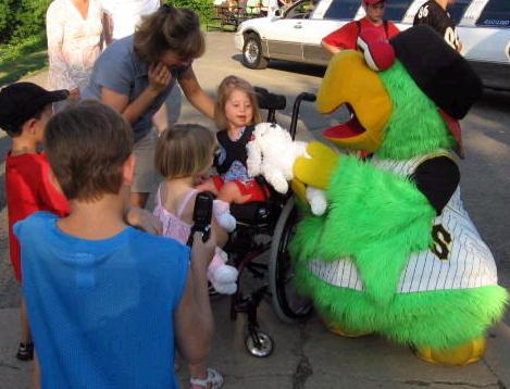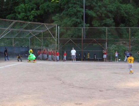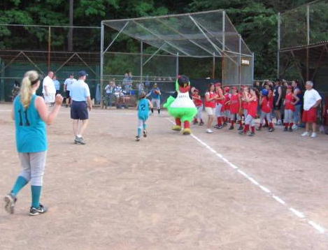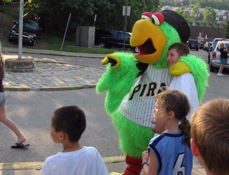 In June of 2006, the zany mascot of the Pittsburgh Pirates, The Pirate Parrot, paid a surprise visit to Brookline Park and Sam Bryen Fields. The unexpected guest arrived in a limosine that caught the eye of most people mingling in the park. The car pulled up to the ballfield entrance, the door opened, and out popped the Parrot. The unexpected appearance had most people stunned, and the kids rushed to meet the overstuffed bird. The Parrot mingled with fans near the front entranceway, then made its way to the baseball, then the softball field. The Avian Anomaly took a turn at the plate on both stops. After a weak at bat on the baseball diamond that resulted in a foul for the fowl, the Parrot moved on to the softball scene. The girls dished up a sweet one and the Parrot hit the ball into the gap. As the outfielders ran towards the fence to field the ball, the feathered fowl circled the bases, it's oversized feet kicking up a trail of dust, for an inside-the-park homerun. Go Bird! After a couple personal photo ops, the Parrot retired to his private stretch-birdcage and flew the coup, but not before giving the parents and children of the Brookline Little League a night to remember. Click on images for larger pictures * Photos taken by Shawn McMahon * |