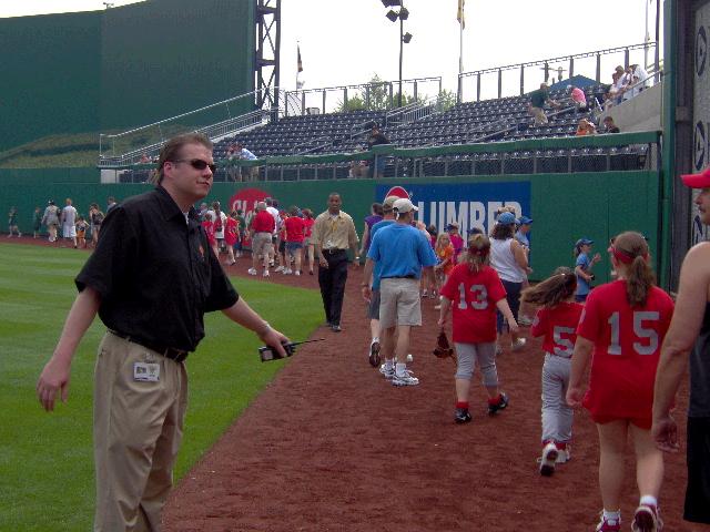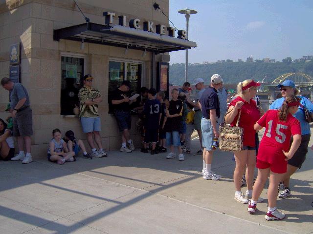 In May of 2005, the players, coaches and parents of the Brookline Little League were treated to a day at PNC Park. Hundreds of Brookline fans attended the game and watched as the Pittsburgh Pirates defeated the Atlanta Braves. The crowd gathered in the plaza outside the stadium before the game. The weather was hot, but the kids found the water park to be a fine place to cool off. Shortly before gametime, everyone was invited inside the stadium for a walk around the warning track. A few Pirates players were on hand to greet the young ballplayers, and a field camera projected everyone's image onto the PNC scoreboard as they came past third base. It was a fun day for everyone who attended. Special thanks go out to Greg Jones, who organized the event. Click on images for larger pictures * Photos taken by Shawn McMahon * |