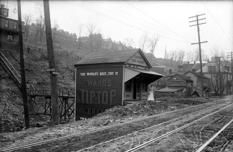 Stetson Street, on West Liberty Avenue, near Cape May Avenue, in 1912. This is the site of the Central Meat Market. To the left out of view was the main entrance to the Paul Coal Company's mine, which provided home heating coal for the residents of the surrounding communities. The Paul Place plan of homes is being built on the hillside above, including houses on Wareman and Plainview Avenues. Stetson Street, on West Liberty Avenue, near Cape May Avenue, in 1912. Today there is a roadway connecting Plainview and Woodward to West Liberty. Where the Central Meat Market stood is now the site of Weiss Automotive Service. The hillside is no longer a barren landscape. |