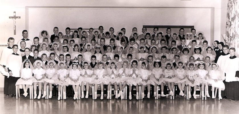 Here are the second graders of Our Lady of Loreto Parish after receiving their First Holy Communion in April of 1962. The celebration was held in the auditorium at Elizabeth Seton High School for the second year in a row. Click on image for a larger photo * Photo provided by Our Lady of Loreto Archives * |