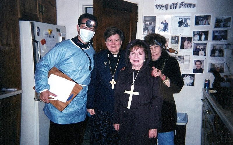 Here are two photos showing some of the fun costumes worn at the Rectory during Halloween 2000. Pictured are Father Luisi (doctor), Bernice Dumitru (bishop), Loretta Fauth (monk) and Betty Mauro (gypsy). Below is Bill Wiseman (pirate) Click on images for larger photos * Photos provided by Resurrection Archives * |