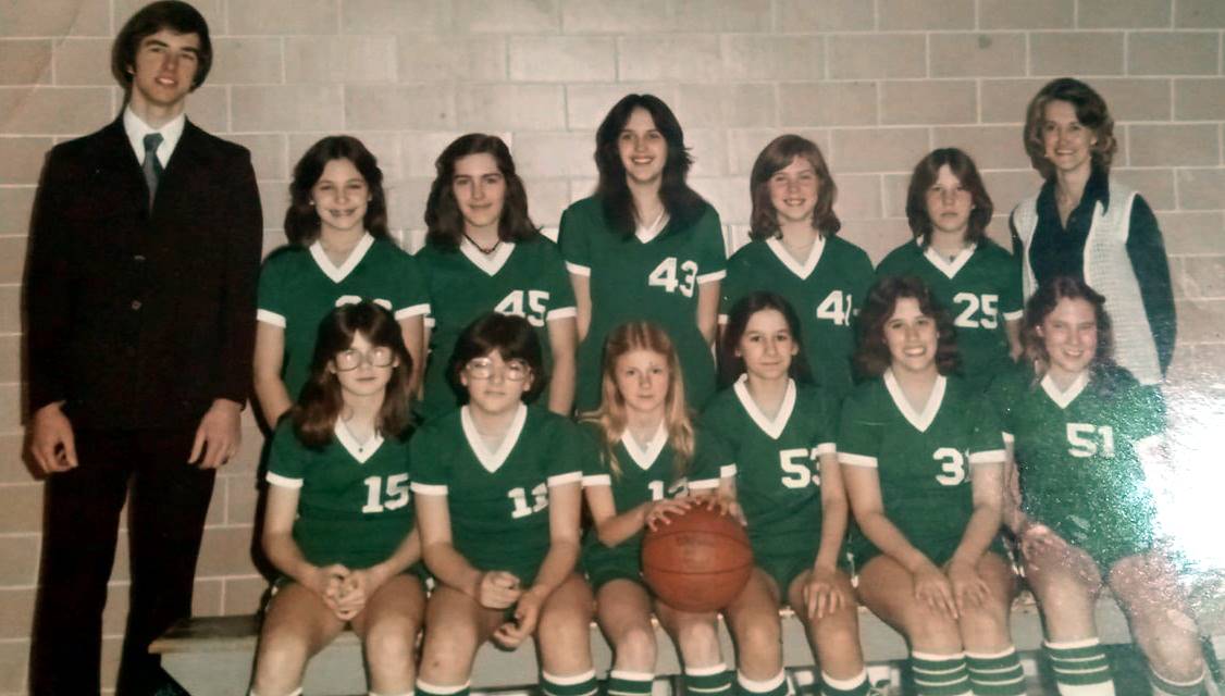 The 1979-1980 Resurrection girls basketball team included: Gina Riccardi, Diane Dolan, Teresa Zirpoli, Maria Munizza, Julie Tripodi, Lucy Loy, Denise O'Donnell, Tammy Stuft, Erin Sharkey. The female coach is Mrs. Stuft.