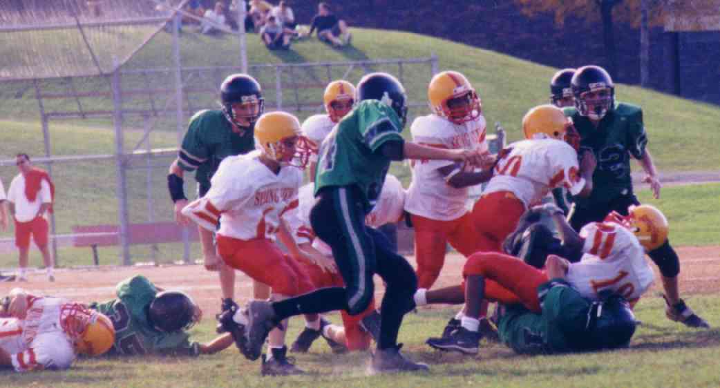 is stopped for no gain by the stifling Brookline defense. The Knights