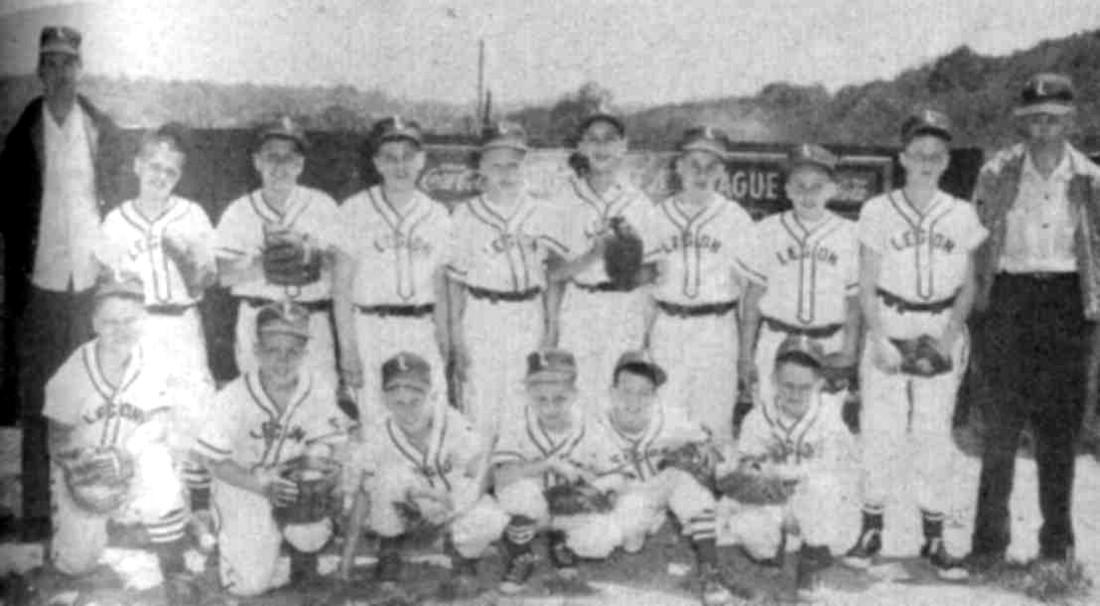 The members of the 1956 American Legion team were: Richard Puerzer, Mullner, Hanselman, DeLuca, Engel, Green, Huettner, W. Dattisman, Stephens, Anderson, Jackie Flavin, DeBasi, Phil Dattisman, Voight, Reinheimer. The manager was Herb Schiebel and the coach was John Voelker. Click on image for a larger picture. * Photo reprinted from the Brookline Journal * |