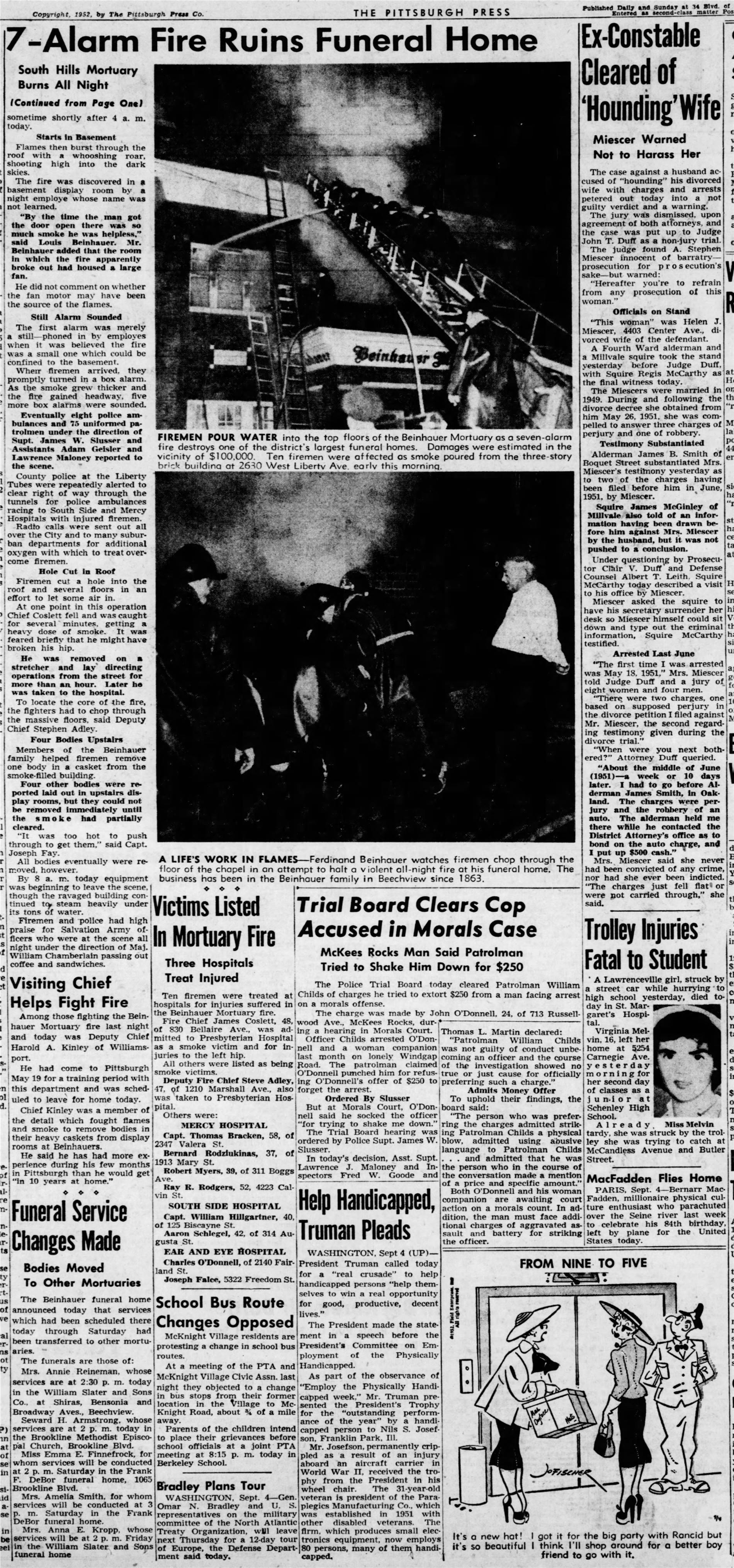 <><><><> <><><><> <><><><> <><><><> <><><><> <><><><> Fire Destroys Mortuary Building - September 3/4, 1952 Tragedy struck on September 4, 1952, when a seven-alarm fire caused irreparable damage to the mortuary building. Scarred walls and charred timbers were all that remained of the thirty-one year old building. The family quickly rebounded from the loss, and a new funeral parlor was constructed shortly afterwards on the same location, one that has been continually enlarged and modernized to this day. <><><><> <><><><> <><><><> <><><><> <><><><> <><><><> Pittsburgh Press, Post-Gazette and Sun-Telegraph Articles * Click on images for readable versions of newspaper pages * <><><><> <><><><> <><><><> <><><><> <><><><> <><><><> The Beinhauer's Brookline Connection Although Beinhauer Funeral Home is located in Beechview, it is often the site of services for residents of the Brookline community, there is another interesting "Brookline Connection" involving the Beinhauer family business. The DeBor family, owners of DeBor Funeral Home on Brookline Boulevard, got their start in the mortuary business at Beinhauer's. Frank F. DeBor, founder of DeBor Funeral Home, had strong ties to the Beinhauer family. His parents, Frank M. and Anna DeBor, both worked for the Beinhauer Funeral Home. Anna was the grand-daughter of Louis Beinhauer, the founder of the Beinhauer family business. Frank also began working for the Beinhauers, and was soon busy arranging and conducting funerals. He and his wife Mary Jo lived for a while on the Beinhauer estate on West Liberty Avenue. In 1950, the DeBor's left Beinhauers to start their own funeral parlor at 1065 Brookline Boulevard.