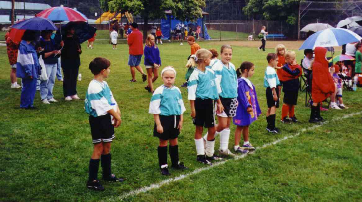 Some Frank & Shirley's Junior players gather on the sideline, waiting patiently for their upcoming contest with Poremski Plumbing. |