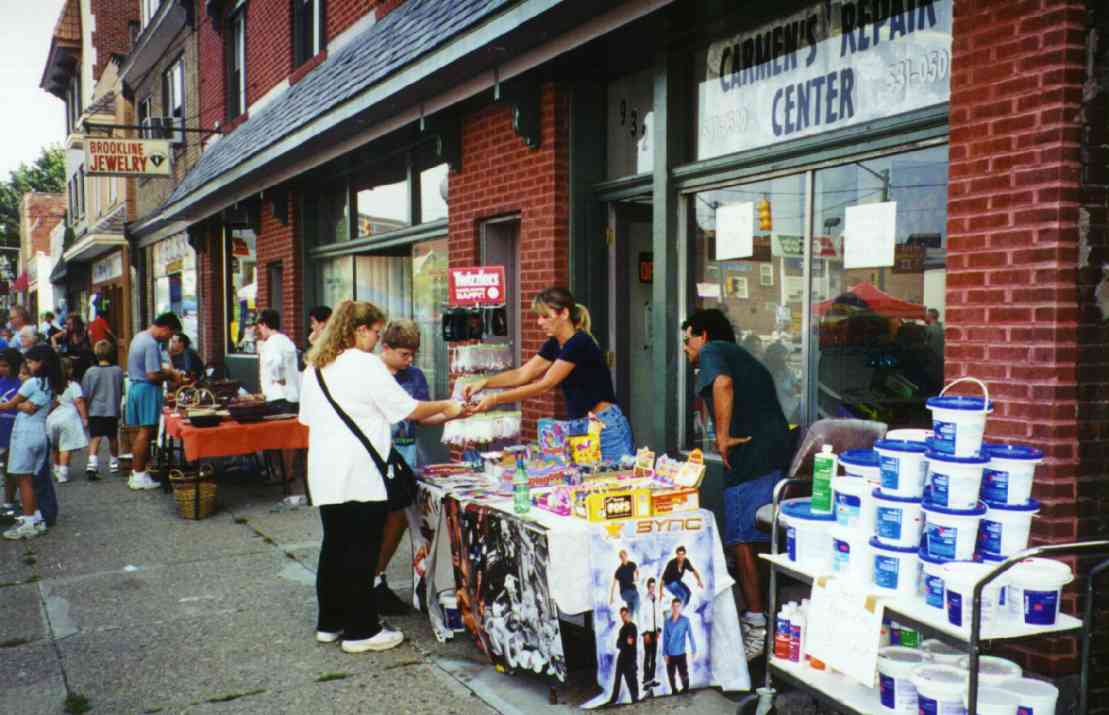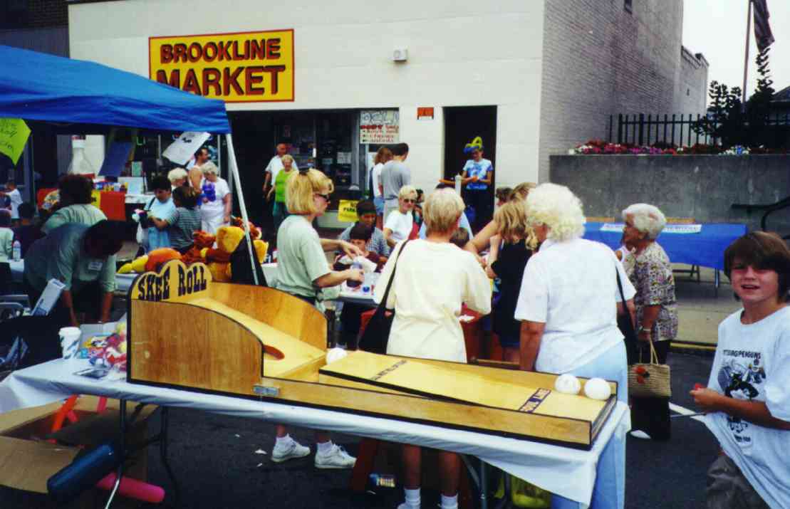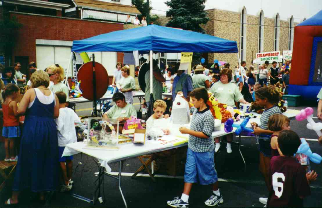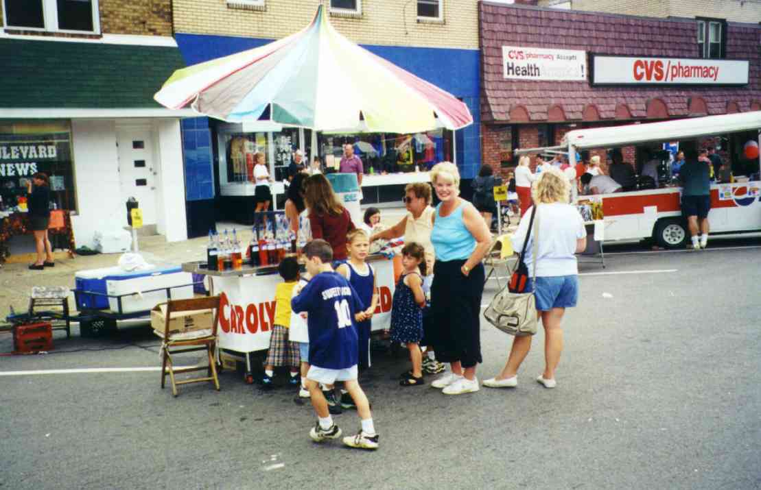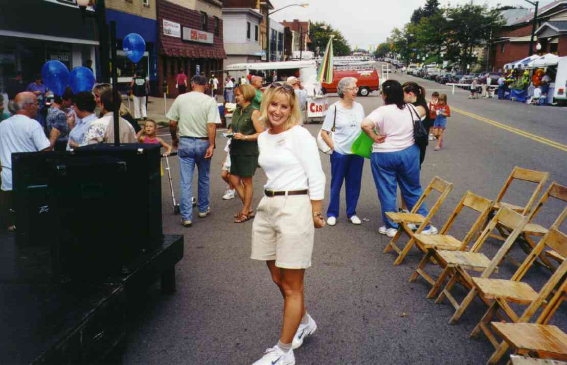 The Autumn Moon Festival was a Brookline event for two seasons, in September 1999 and 2000. The South Pittsburgh Development Corporation, along with the Chamber of Commerce, administered the fall classic. The weekend event featured a variety of events, good food, and a great chance to get out and enjoy a day with friends and neighbors. The 2000 festival, held September 8-9-10, began with an Oldies Dance Friday evening at the International Banquet Hall. DJ Joey Lewis kept the crowd dancing to the sounds of the 60s, 70s and 80s. Many interesting personalities were on hand and the only negative comment yielded was that the lights were turned off too soon. Everyone had a great time. With Brookline Boulevard capped from Stebbins Ave to Flatbush and fine weather from above, Saturday's activities featured crafts, games, prizes, roaming artists, ethnic dancing, live music and lots of good food. Opening ceremonies kicked off at 11:00am and the assembled crowd saw a distinguished lineup of "Brookline Stars," hosted by our one and only District Justice Charles McLaughlin. The speakers included Olympic Gold Medalist and Cleveland Rockers WNBA star Suzy McConnell-Serio, National Wheel-Chair Weightlifting champion Patsy Mitchell, Pirate great Bobby Del Greco, retired traffic policeman Vince Cianca, Jazz pianist Bobby Negri, DJ Tony Mowod, Senator Jack Wagner, Mayor Tom Murphy, County Councilman Wayne Fontana, Retired Police Chief Theresa Rocco and City Councilman Michael Diven. Suzy spoke of her days growing up and training on the streets of Brookline and the encouragement she received from her neighbors and friends. Patsy talked of the trials she has overcome with her disability and the support she received from her home town during her rise to the weight-lifting title. Senator Wagner urged Brookliner's to work together and strive to keep Brookline's business district, the "heart of our community", strong. Mayor Murphy discussed the city's ongoing commitment to improving the Brookline area, including a $5.2 million plan to resurface Brookline Boulevard. Councilman Diven spoke of growing up in Brookline and the tight-knit community spirit that makes it such a special place. And then there was Vince, the nationally renowned traffic policeman who dazzled crowds with his colorful direction of motorists in downtown Pittsburgh. There may never again be so artful a character as Officer Cianca, and the sight of him in his old uniform and white gloves conjured up a flood of amusing and delightful images from Sixth and Smithfield. Also seated amongst the distinguished guests was Brookline's jeweler and elder statesman Jim Mongelli, long-time owner of Brookline Jewelry. Mr. Mongelli was presented with a framed recognition award by Mayor Murphy and the Brookline Chamber of Commerce for his half-century of service to the community. The 2000 Autumn Moon Festival distinguished guests and volunteers. After the opening ceremonies had completed, the stage was prepared for the live entertainment, showcasing bands like The Stickers, The Classiques and local rockers Doc Roc and the Interns, featuring Brookline's own Mark and Jake Zucco. There were also choral groups, dance troops and a high school band over the course of the two-day show. A walking magician, a juggler, spin art, face painters, and a giant air-bag (moonwalk) were on hand to keep the kids adrenaline flowing. A dunking booth was erected Sunday and attracted a lot of attention. Sunday's lineup was highlighted by the classic car exhibition. The boulevard was lined with vintage cars from the past several decades. It was quite a scene, and many oldtimers must have felt a twinge of reminiscence as every model must have been a common site on Brookline Boulevard at one time or another over the long history of our community. Prior to the festival, local schools (West Liberty Academy, Pioneer Education Center, Seton Center and Brookline Elementary) were asked to participate in the first ever "Autumn Moon Festival" poster contest. There were over 100 entries in three categories (grades 0-2, 3-5, 6-8). The winners were: More Photos from the 2000 Festival