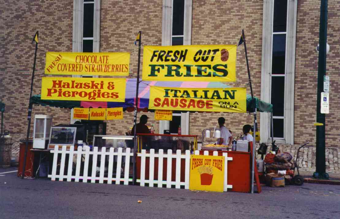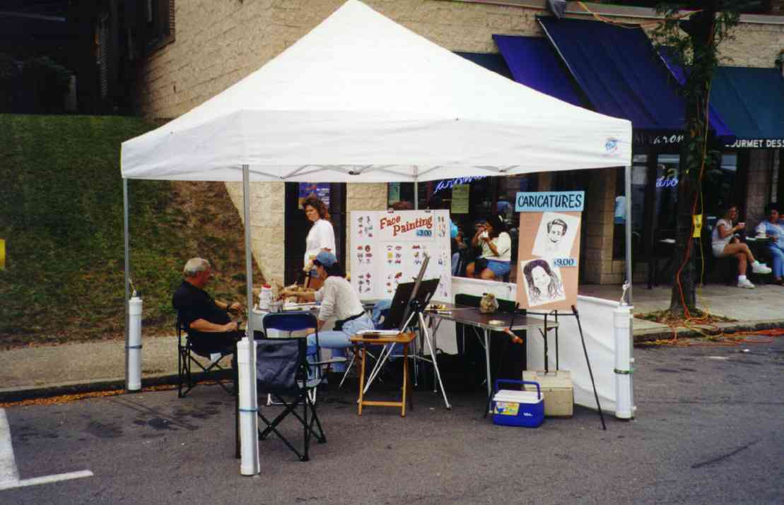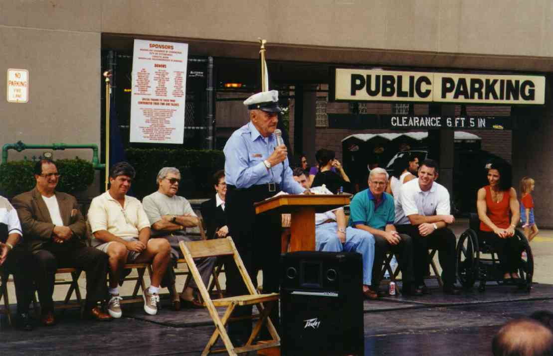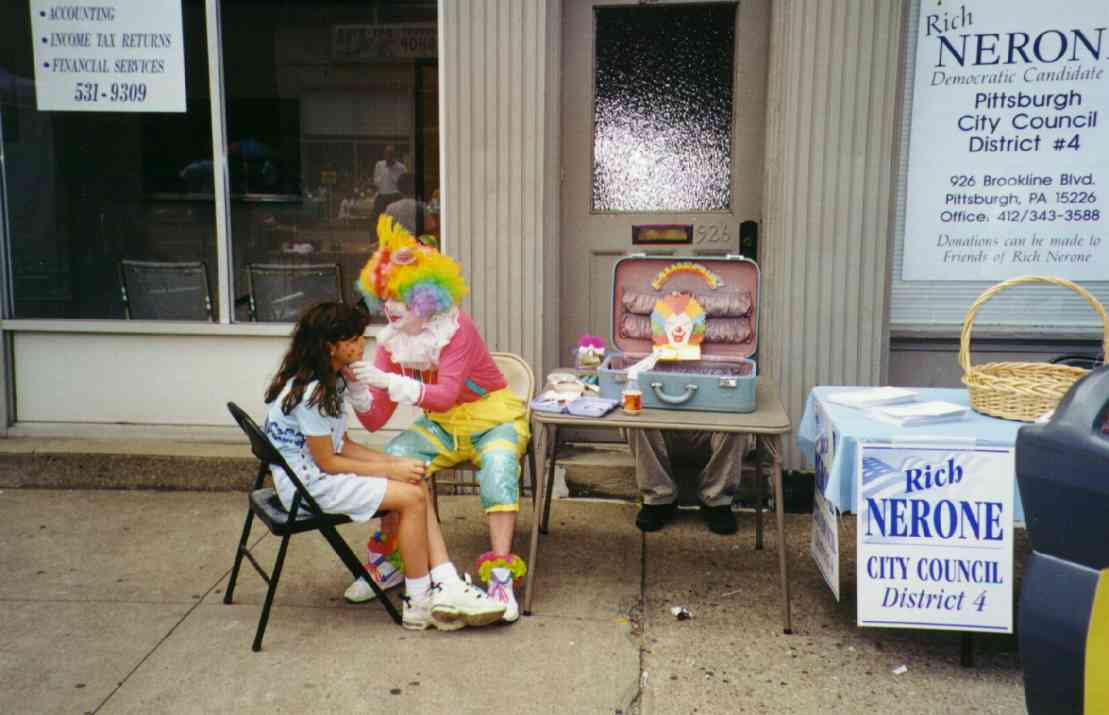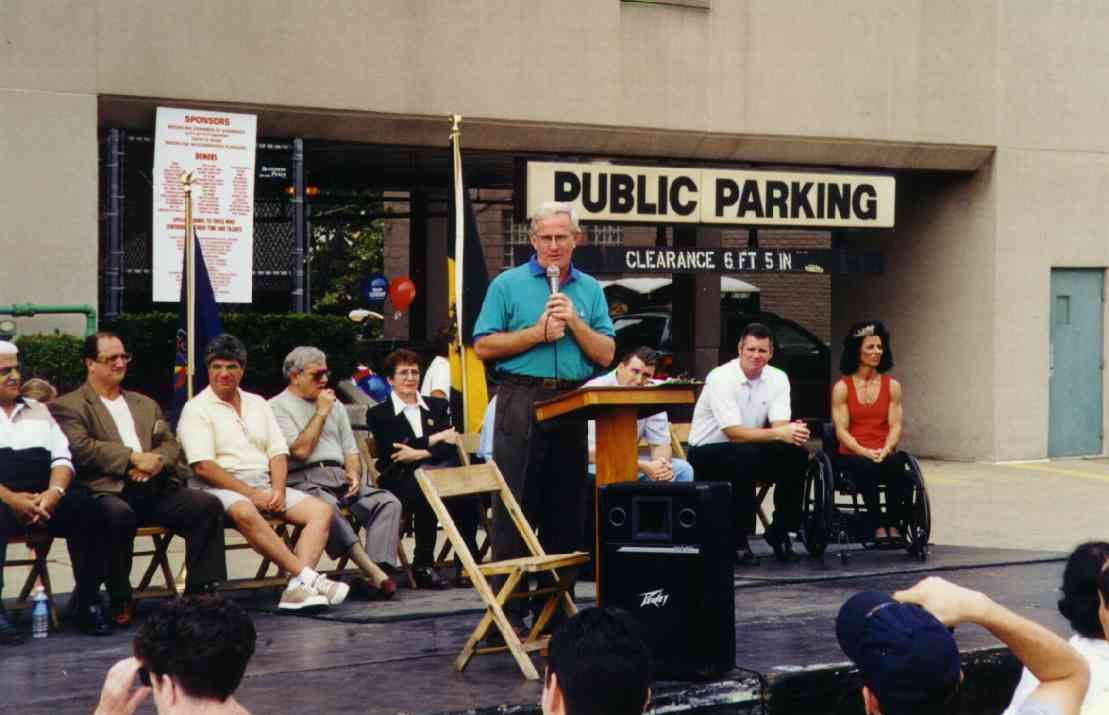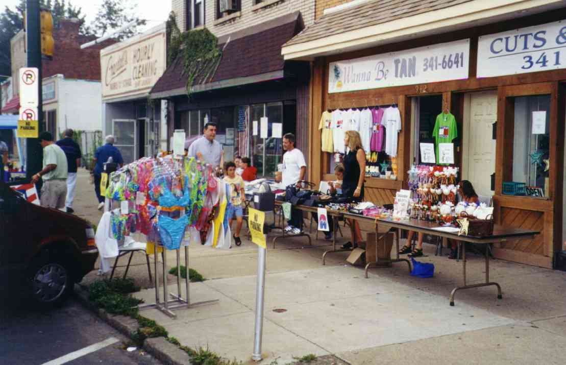 The Autumn Moon Festival was a Brookline event for two seasons, in September 1999 and 2000. The South Pittsburgh Development Corporation, along with the Chamber of Commerce, administered the fall classic. The weekend event featured a variety of events, good food, and a great chance to get out and enjoy a day with friends and neighbors. The 2000 festival, held September 8-9-10, began with an Oldies Dance Friday evening at the International Banquet Hall. DJ Joey Lewis kept the crowd dancing to the sounds of the 60s, 70s and 80s. Many interesting personalities were on hand and the only negative comment yielded was that the lights were turned off too soon. Everyone had a great time. With Brookline Boulevard capped from Stebbins Ave to Flatbush and fine weather from above, Saturday's activities featured crafts, games, prizes, roaming artists, ethnic dancing, live music and lots of good food. Opening ceremonies kicked off at 11:00am and the assembled crowd saw a distinguished lineup of "Brookline Stars," hosted by our one and only District Justice Charles McLaughlin. The speakers included Olympic Gold Medalist and Cleveland Rockers WNBA star Suzy McConnell-Serio, National Wheel-Chair Weightlifting champion Patsy Mitchell, Pirate great Bobby Del Greco, retired traffic policeman Vince Cianca, Jazz pianist Bobby Negri, DJ Tony Mowod, Senator Jack Wagner, Mayor Tom Murphy, County Councilman Wayne Fontana, Retired Police Chief Theresa Rocco and City Councilman Michael Diven. Suzy spoke of her days growing up and training on the streets of Brookline and the encouragement she received from her neighbors and friends. Patsy talked of the trials she has overcome with her disability and the support she received from her home town during her rise to the weight-lifting title. Senator Wagner urged Brookliner's to work together and strive to keep Brookline's business district, the "heart of our community", strong. Mayor Murphy discussed the city's ongoing commitment to improving the Brookline area, including a $5.2 million plan to resurface Brookline Boulevard. Councilman Diven spoke of growing up in Brookline and the tight-knit community spirit that makes it such a special place. And then there was Vince, the nationally renowned traffic policeman who dazzled crowds with his colorful direction of motorists in downtown Pittsburgh. There may never again be so artful a character as Officer Cianca, and the sight of him in his old uniform and white gloves conjured up a flood of amusing and delightful images from Sixth and Smithfield. Also seated amongst the distinguished guests was Brookline's jeweler and elder statesman Jim Mongelli, long-time owner of Brookline Jewelry. Mr. Mongelli was presented with a framed recognition award by Mayor Murphy and the Brookline Chamber of Commerce for his half-century of service to the community. The 2000 Autumn Moon Festival distinguished guests and volunteers. After the opening ceremonies had completed, the stage was prepared for the live entertainment, showcasing bands like The Stickers, The Classiques and local rockers Doc Roc and the Interns, featuring Brookline's own Mark and Jake Zucco. There were also choral groups, dance troops and a high school band over the course of the two-day show. A walking magician, a juggler, spin art, face painters, and a giant air-bag (moonwalk) were on hand to keep the kids adrenaline flowing. A dunking booth was erected Sunday and attracted a lot of attention. Sunday's lineup was highlighted by the classic car exhibition. The boulevard was lined with vintage cars from the past several decades. It was quite a scene, and many oldtimers must have felt a twinge of reminiscence as every model must have been a common site on Brookline Boulevard at one time or another over the long history of our community. Prior to the festival, local schools (West Liberty Academy, Pioneer Education Center, Seton Center and Brookline Elementary) were asked to participate in the first ever "Autumn Moon Festival" poster contest. There were over 100 entries in three categories (grades 0-2, 3-5, 6-8). The winners were: More Photos from the 2000 Festival