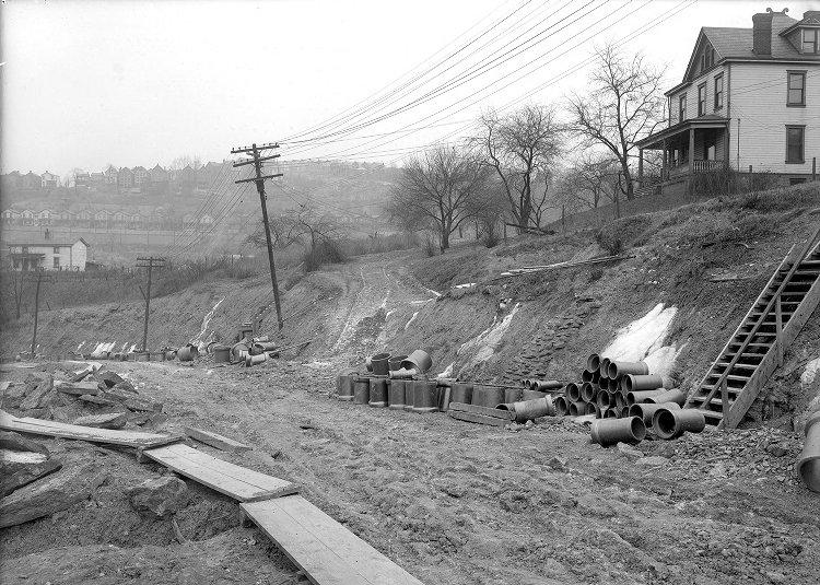 This is the lower end of Pioneer Avenue, near the intersection with West Liberty Avenue, in January 1924. Sewer lines were being laid and the hill-scaling gateway to Brookline would soon be paved in belgium blocks. The photo above shows the lower bend of Pioneer Avenue, where it abuts the train tracks. The picture was taken from near the corner of West Liberty Avenue. The cement landing shown was used as a loading/staging area for construction materials that were delivered by train. The materials were then hauled to the various construction zones by wagon. This landing was in use for several years during this major growth and development phase in Brookline and the South Hills. Click on images for larger pictures