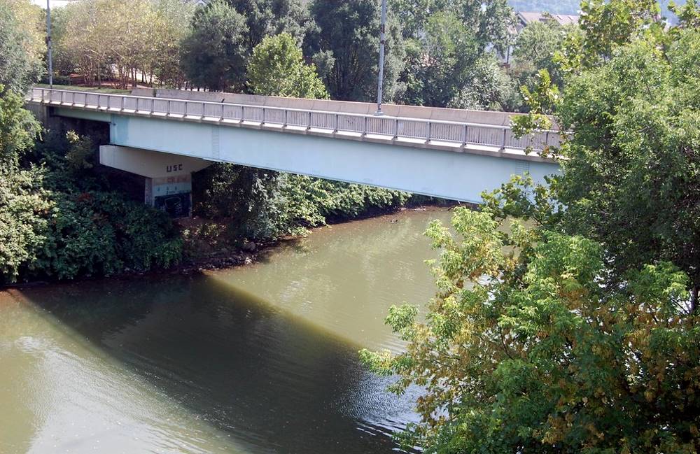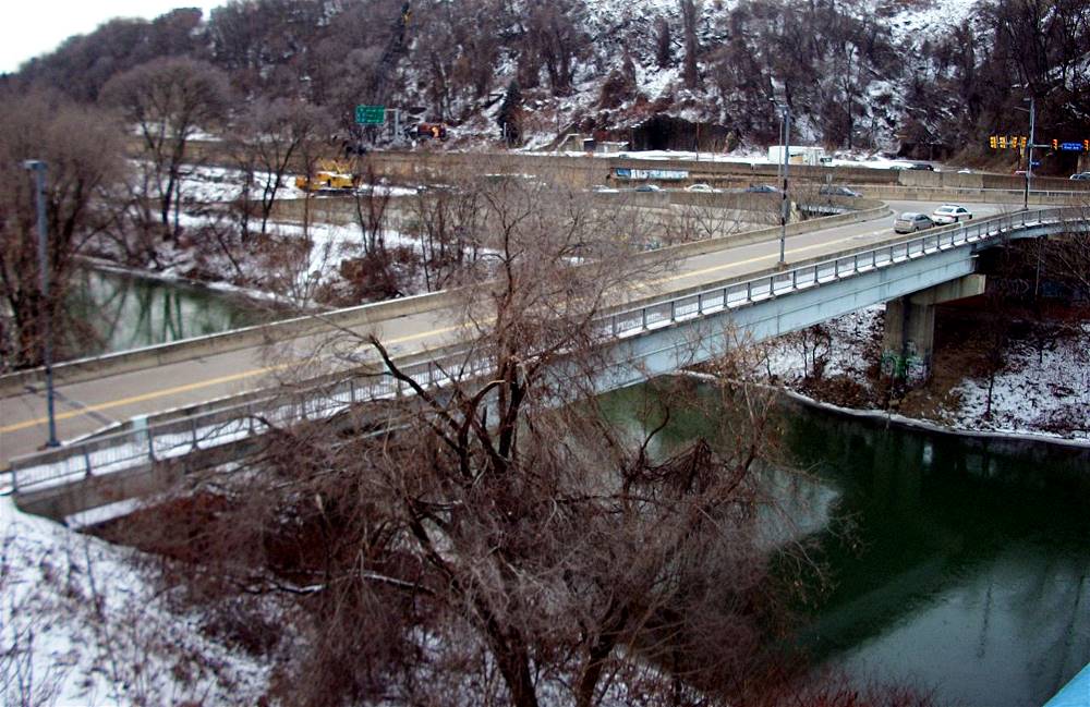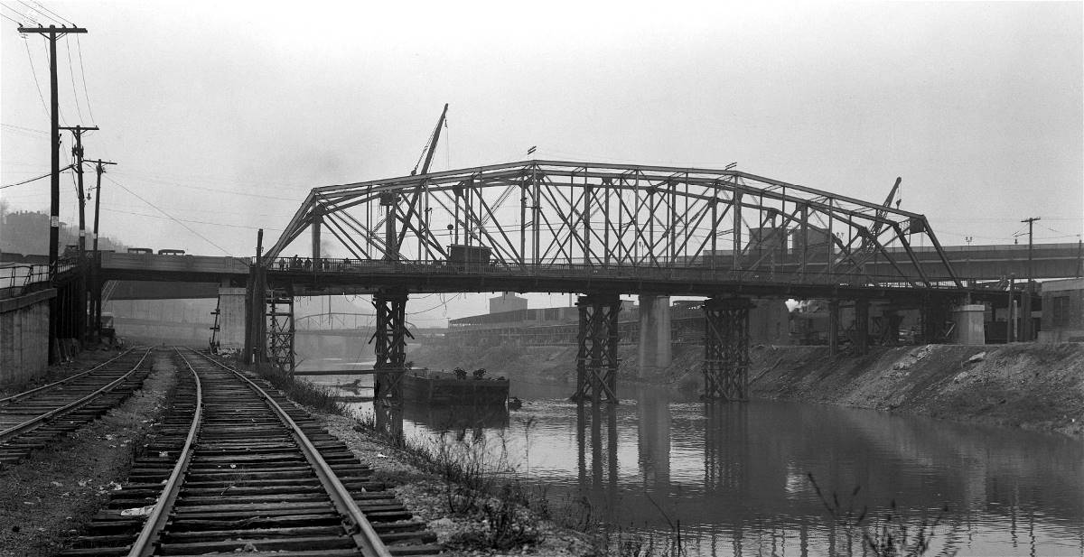 This made the 30th Street back channel bridge all that much more essential, being the only way on of off the island for the ever-increasing tide of motorised traffic. The 31st Street Bridge did provide a secondary link to the 30th Street Bridge via a short ramp to, or extension of, the River Road viaduct. Commuters on foot from the south shore, who had grown accustomed to the pedestrian suspension bridge, now had a much longer walk to get to work. Despite this minor setback, business and employment on the island flourished. The temporary 30th Street Cable Bridge across the main channel, along with the forty-one year old stone piers, were removed. Bridge Replaced and Reconfigured In 1939 the aging back channel span was replaced with a similar single arch design. The new bridge, the third to stand at that spot, was built next to the old span and then slid into place. One major reconfiguration to the traffic pattern came when the existing small ramp from River Road to East Ohio Street was removed. To get from the north end of the bridge to East Ohio Street, which was also in a process of renovation, vehicles and pedestrians would now turn onto River Road and use the high level bridge to reach the main highway.