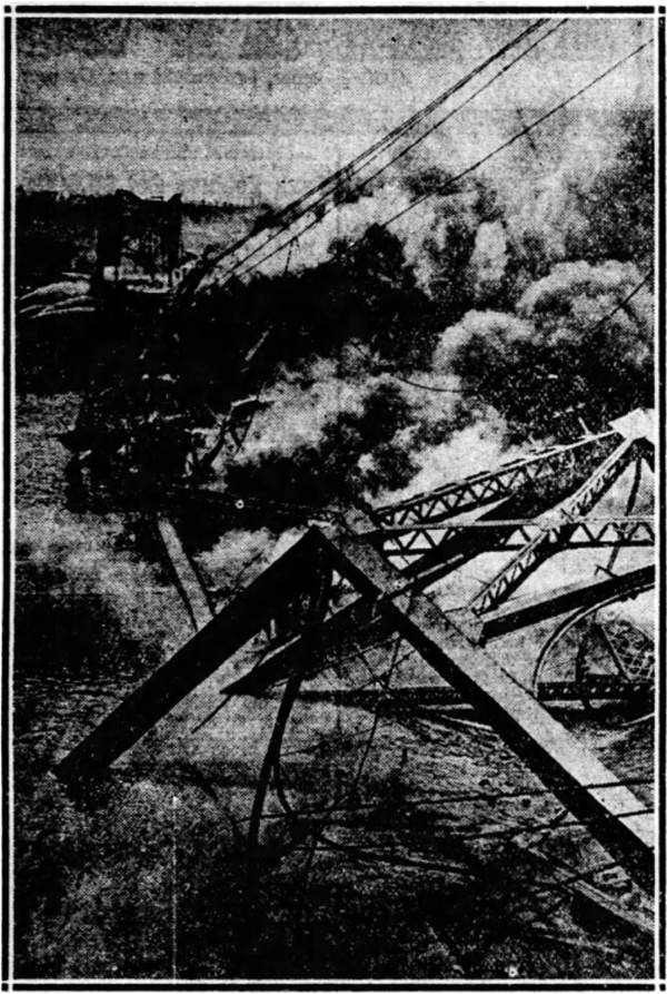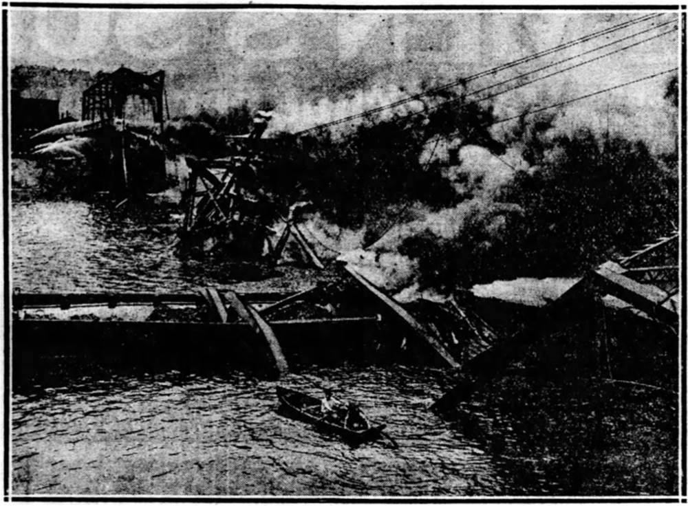 Disaster Strikes Then, as reported by the Pittsburgh Post-Gazette on July 9, 1921, disaster struck. No one is sure exactly how the fire started, but a watchmen noticed smoke on the main center span that soon turned to flames. The bridge attendant sounded an alarm and immediately joined motorists E.G. Miller, of Mount Lebanon, and George F. Stoker, of Mount Washington, in trying unsuccessfully to extinguish the flames. Several more alarms were sounded and soon firefighters from companies on either side of the river were on location, as well as a pumping boat. Activity on both sides of the river came to a halt as all eyes were on the bridge. The tar and creolin that covered the wooden planking quickly went up in flames. In no time the heat from the flames weakened the supporting stuctural girders and beams. Firemen working on the northern span heard the metal beginning to give way. They quickly retreated back to the island. No sooner had they reached safety the northern two sections gave way and collapsed into the main river channel, narrowly missing the pumping boat. Two coal barges were sunk and two other set ablaze by falling debris.