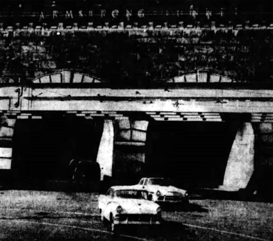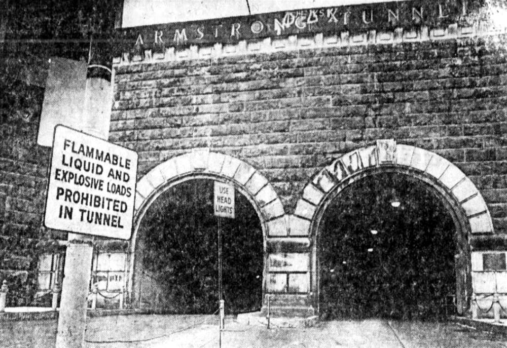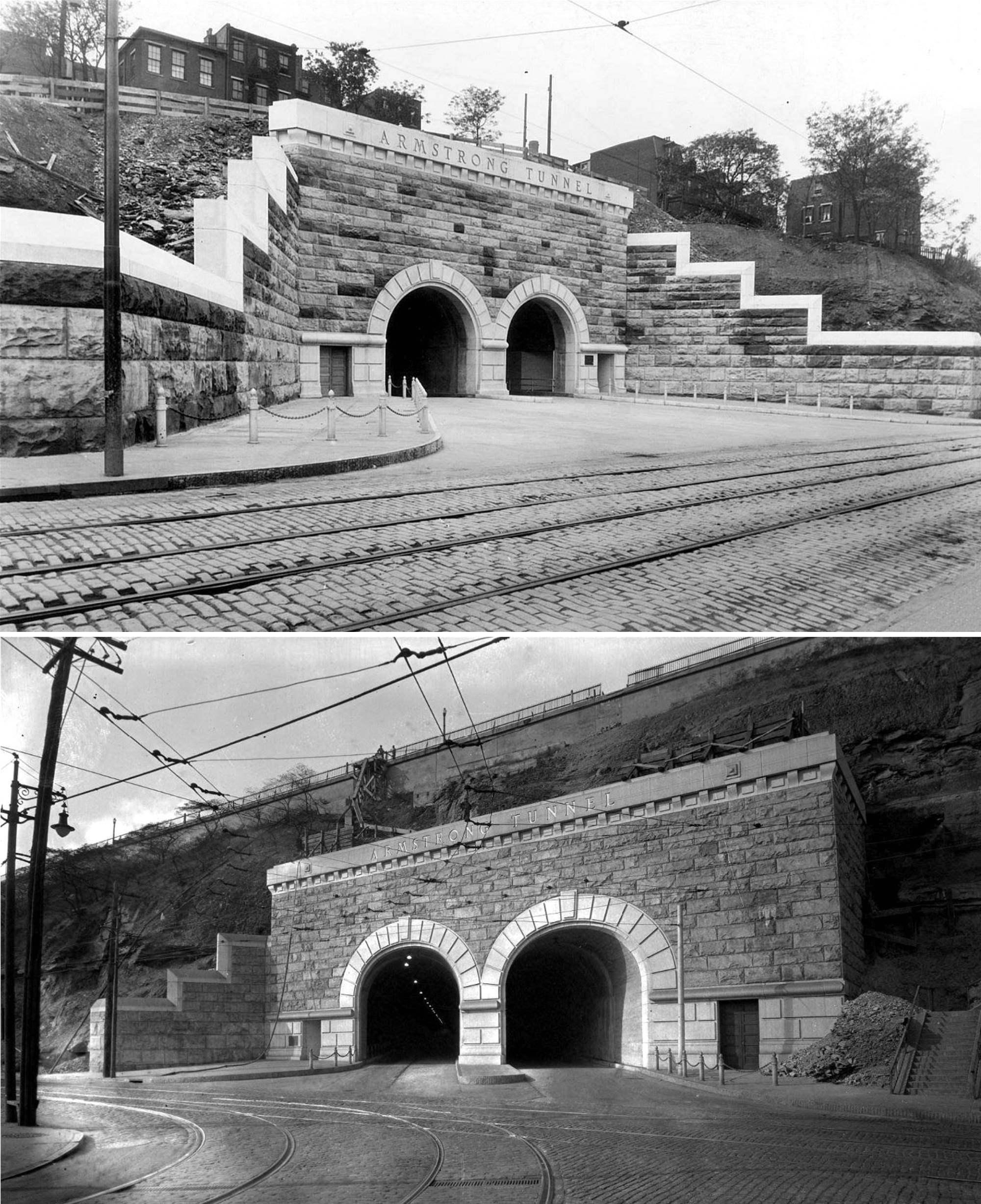 Commissioner Armstrong cut the ribbon barriers at both ends of the twin tubes and duplicate dedication tablets at were unveiled at each portal. The Armstrong Tunnel was the second vehicular and pedestrian tunnel completed in Pittsburgh. The total cost was $1,539,000. In addition, the county paid out $100,000 in blast damages to residents atop the bluff. The 45-Degree Angle The Armstrong Tunnel portals feature Italian Renaissance sandstone walls and cut-stone portals, trimmed with granite. The tunnel vault is concrete and includes a pedestrian walkway on the western side. There is no ventilation system installed. Engineers reasoned that the short length of the tunnels, coupled by both a natural air flow and a push by truck traffic would be sufficient to keep the tubes clear of a buildup of toxic exhaust fumes. The tubes are noted for the 45-degree curve in the twin horseshoe design. Originally envisioned as a straight passage, the bend near the Forbes Avenue portal was the unforeseen result of several factors: mines, geological factors, property rights and alignment with existing roads. When it opened, these twin tubes were the first curved vehicular tunnels in the world.