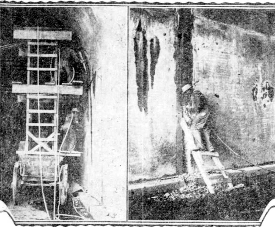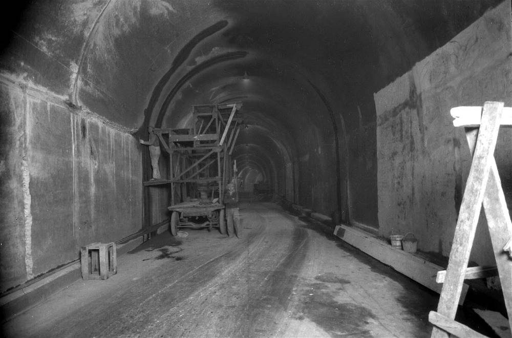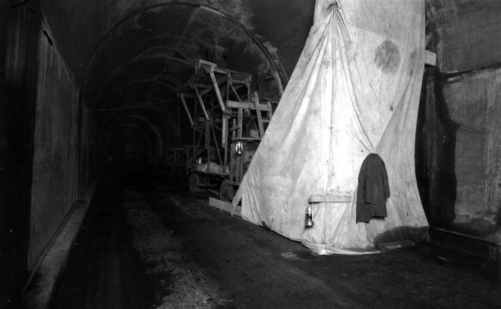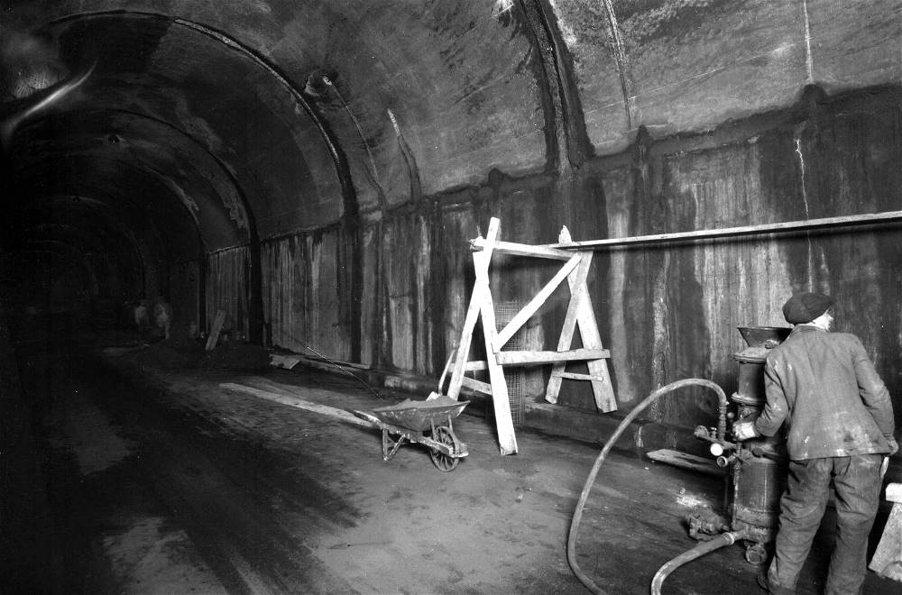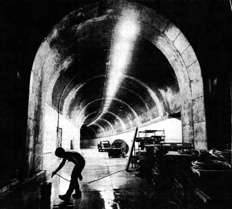 Water Seepage Almost from the first day of operation, the Armstrong Tunnel has been plagued by water seepage from the natural springs in the hill above the eastern tube. Water made its way through joints in the reinforced concrete and began a steady trickle along the wall near the Second Avenue entrance. Six months after the grand opening, contractor Booth and Flinn was back at the tunnel making repairs.