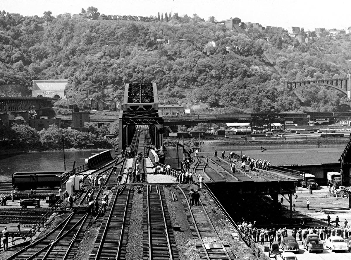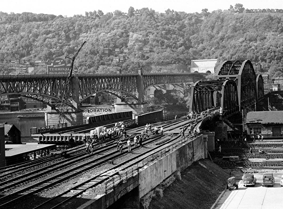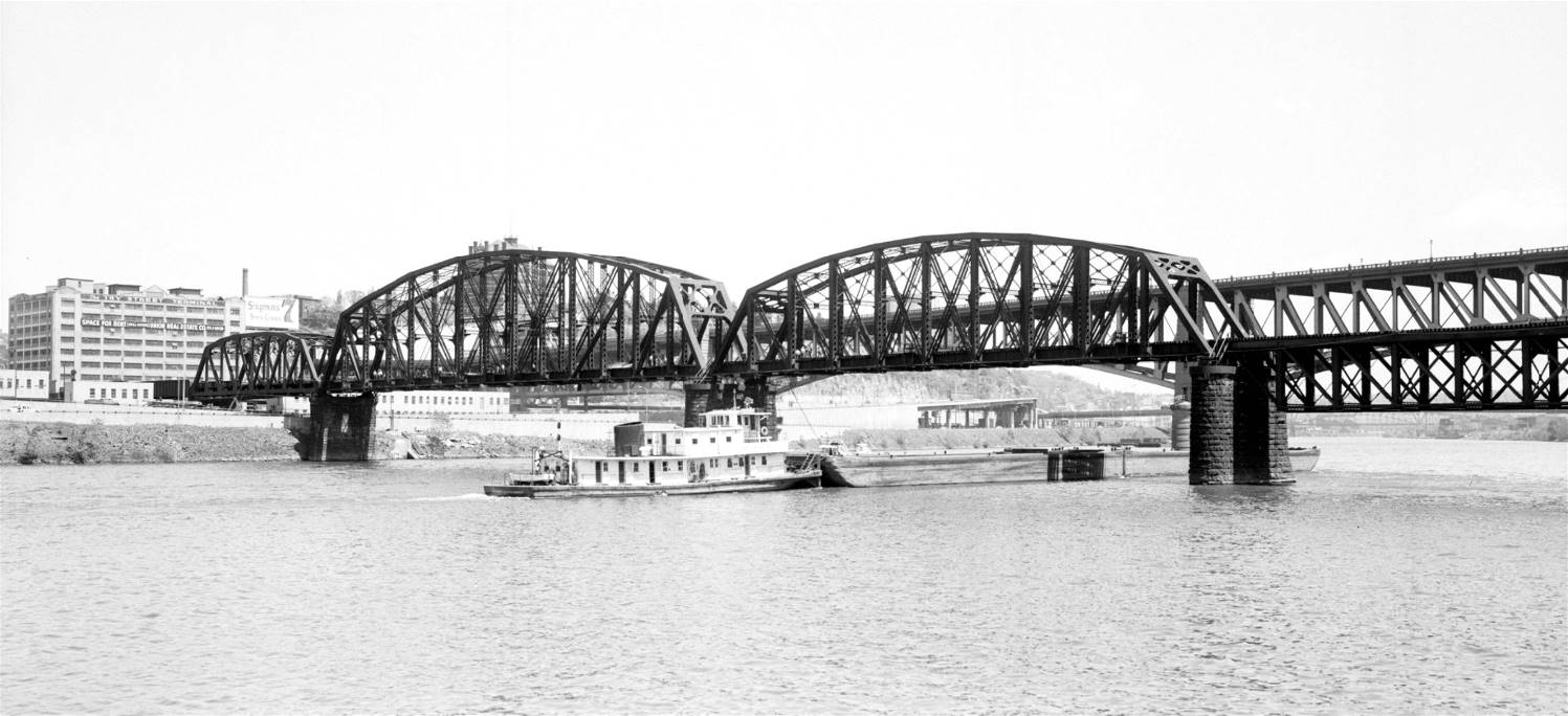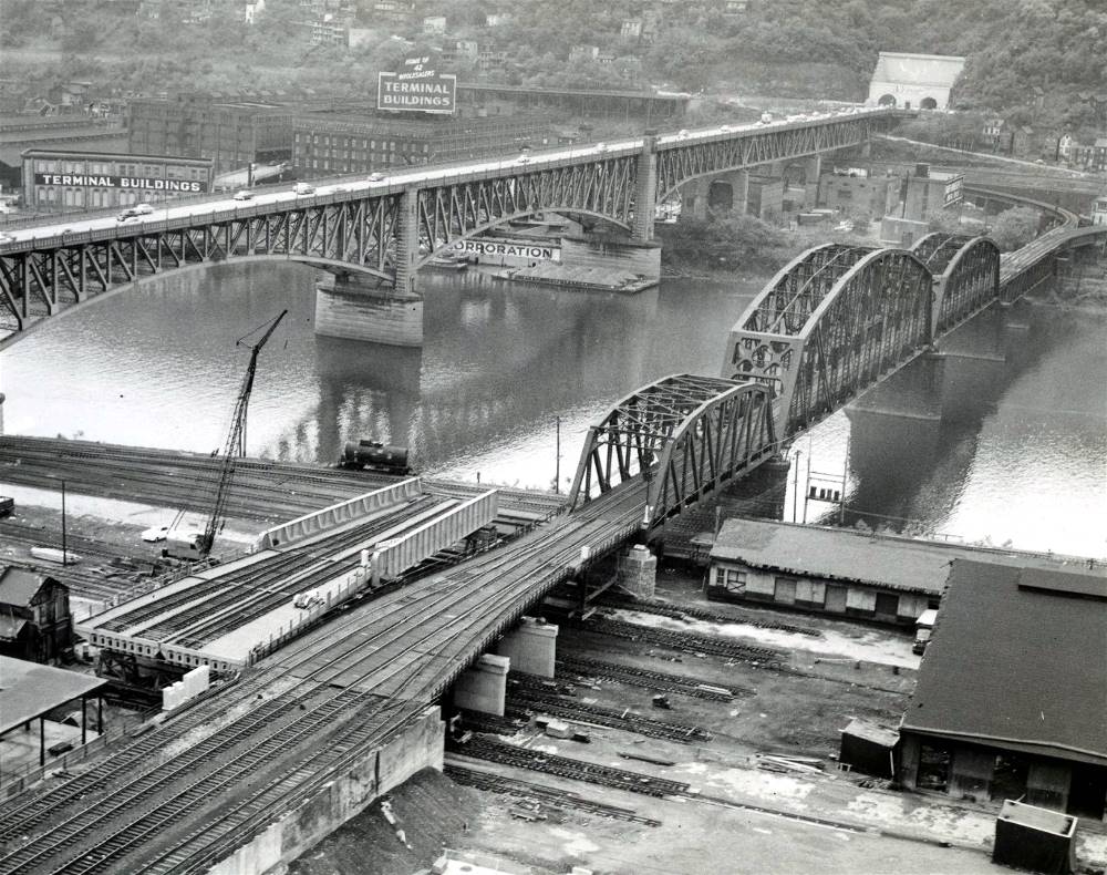 The major modification was made in 1889, adding a second through truss on the northern end. This was to accomodate a grade seperation project with the B&O Railroad, which traveled along the northern shore, and with vehicular traffic along Second Avenue. The railroad yard and Second Avenue were lowered and the additional through truss gave the necessary clearance for traffic. A series of plate girder extensions were constructed to carry the railroad line from the bridge past Fourth Street and into the tunnel, which led to Union Station at Liberty Avenue and 11th Street. The second bridge, which is still in use today, was a complete replacement, built in 1903 to handle heavier loads and increased Pennsylvania Railroad traffic. The span was modified several times over the years to accomodate various grade seperation projects as the City of Pittsburgh grew and developed. The last major modification occured in 1982, when the bridge was renovated and reconfigured to accomodate light rail traffic.