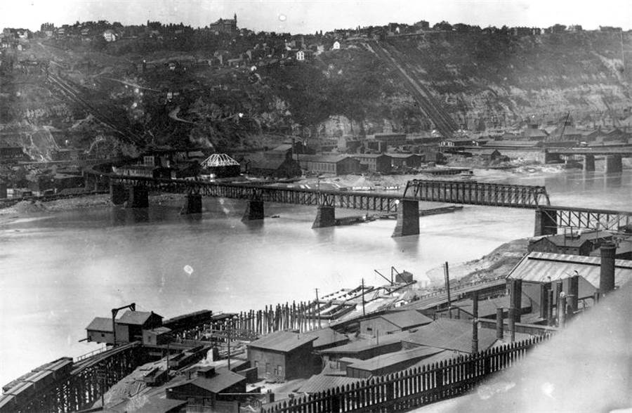 The Panhandle Bridge was built in 1903, and was the second railroad bridge on the site since 1863. The first bridge was built in 1863 and crossed the river via seven main spans, similar in length and location as current bridge. The deck of 1863 bridge was at the same elevation as downtown streets in the area and included grade crossings at Second Street and Fourth Street, where the tracks entered a converted railroad tunnel that was originally constructed for the Pennsylvania Canal in 1828.