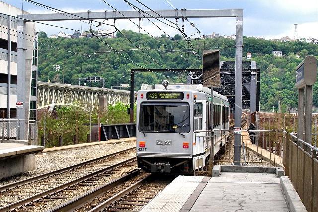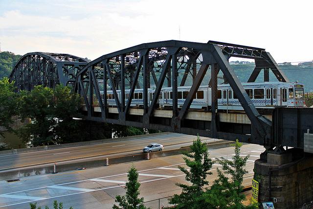 The Panhandle Bridge, officially known as the Monongahela River Bridge, is a century-old railroad bridge that is now part of the Pittsburgh Light Rail System. The span is a combination truss-type and through truss bridge that carries rail traffic over the Monongahela River from a Y-section on the southern shore to a subway tunnel entrance near Fourth Street in downtown Pittsburgh. It stands between the Liberty Bridge to the east and the Smithfield Street Bridge to the west.