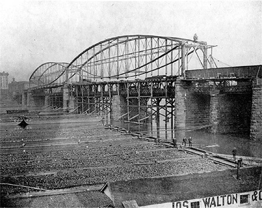 Renamed the Smithfield Street Bridge, the new bridge was built at a cost of roughly $500,000 and opened to traffic on March 19, 1883. At this time the abandoned Roebling was dismantled and the old stone piers removed. Gaps in the new piers, designed around the old bridge, were filled in with masonry. As with it's predecessors, a toll was required to cross the bridge.