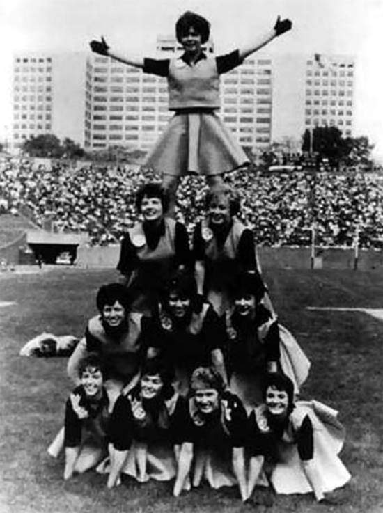 The squad was increased to ten girls, which made it possible to do a classic pyramid, which from then on became one of the Steelerettes trademark routines. Carefully choreographed acrobatic maneuvers were used to disassemble the pyramid. The girl in the top position did a backflip onto the field, then a series of cartwheels ending in a split to begin the formation. The next two did their backflips and cartwheels ending in a split on each side of the first girl and so on until we ended up forming a "V" on the field. The girls performed this several times during the game and it was a genuine crowd pleaser. The pyramid was difficult to pull-off, and sometimes the girls collapsed into a pile. The 1963 Steelerettes, as well as the 1969 squad, are immortalized in the Pro Football Hall of Fame. Among the films that are shown in the theater are bloopers. The opening scenes of two such films show the pyramids collapsing in one of the Steelerettes humorous heaps. Another well-rehearsed routine was the line dance that followed every Steeler score, performed to the rhythm of "The Pittsburgh Steelers Fight Song." The year 1963 was another fantastic season for the Steelers and the Steelerettes. The football team finished with a 7-4-3 record and the Steelerettes were making regular appearances at charity functions, hospitals and schools. The talented ladies were also regular performers during halftime at the Duquesne University basketball games. Being a member of the Steelerettes was not all fun and games. It involved hard work and discipline, and evolved into a year-round activity. Practices were held after school nearly every day, and weekend workouts lasted four and five hours. For all of this hard work, their only compensation was a couple of complimentary tickets to each Steeler game. It didn't matter, the Steelerettes were having a great time. The following year the Steelerettes had their biggest group of applicants at tryouts. While interest in the cheerleaders was peaking, the Steelers themselves struggled to a 5-9 record. In 1965, the Steelerettes featured Donna Talarico, Mary Ann Wolfe, Cindy Murray, Jan Rudolph, Diane Battiste (Captain), Barb Pawlesh, Patty Tanner, Valerie Mafrice and Marlene Phillips. While the popularity of the Steelerettes continued to flourish, the Steelers fell further into despair, finishing with a 3-11 record. By 1966, the Steeler cheerleaders had become as much a part of the Steelers wholesome image as the players themselves. They had even gained the acceptance of the Chief, Art Rooney Sr., who never really liked the idea of "girls" on the football field. Through their hard work and dedication, the Steelerettes had earned his respect and trust.