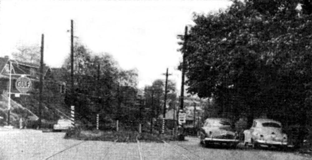 Here is Brookline Boulevard at the intersection with Edgebrook Avenue in 1951, across the street from DeBor Funeral Home. The Gulf station on the left has been replaced by a Seven-Eleven convenient store and gas station. Up until 1966 trolley tracks intersected the Boulevard, and in 1951, at this point, the full pavement ended. Boulevard traffic was diverted onto narrow lanes that ran parallel to the tracks. The steel poles and tight squeeze were the source of many vehicular accidents and much consternation among residents. At the end of the two block section of unpaved trolley right-of-way is the intersection at Breining Street near the present-day Parkview Manor apartments. In 1951 a shopping center stood in place of the highrise. The East Brookline Shopping Center was home to Liepack's Pharmacy, Open Pantry Grocery Store and the Big Bundle Coin-Op Laundramat. Again, the steel poles make for a tight squeeze and dangerous area. Below is the 1400 block of Brookline Boulevard, approaching Witt Street, where only one lane of traffic was possible due to curbside parking. To the left over the hillside is the Trolley Loop and a wooded ravine owned by the Brookline Community Center Association. Today, there are two lanes and off-street parking available on the right. A growing problem at the time were the dangers caused by the increasing number of vehicles on the road. This section of Brookline Boulevard was deemed an unsafe area to drive (judging by the photos for good reason) and residents were lobbying hard to have the city remove the steel poles and widen the street.. Click on images for larger pictures. |