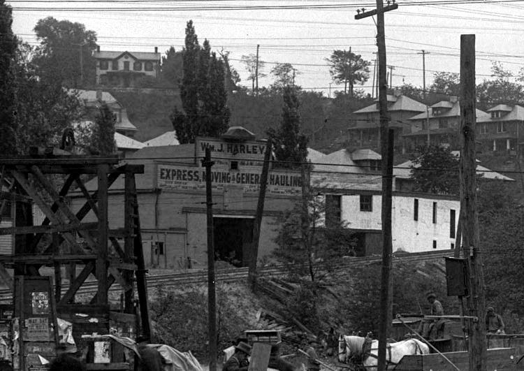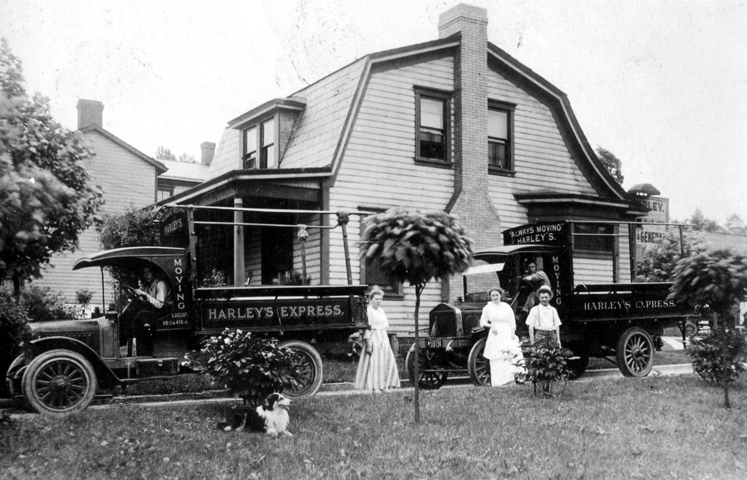 The home, family and employees of George T. Harley, at 132 Brookline Boulevard (now Bodkin Street), and his business, Wm. J. Harley Express Moving & General Hauling, located next door. The Harley's Express business, founded by George Harley's father, William J. Harvey of Lawrenceville, and had been around for several years prior to opening the Brookline location in 1909. The company remained active into the 1920s, while the family of George Harley lived in the adjacent home until the late-1930s. The home, barn and attached one-story stucco office building were eventually sold to Fred Breauninger, who started the South Hills Sewing Machine Company. The company was in operation from the mid-1940s to the late-1950s. The home and frame barn are no longer standing, but the white stucco office building is still there, at 165 Brookline Boulevard.
