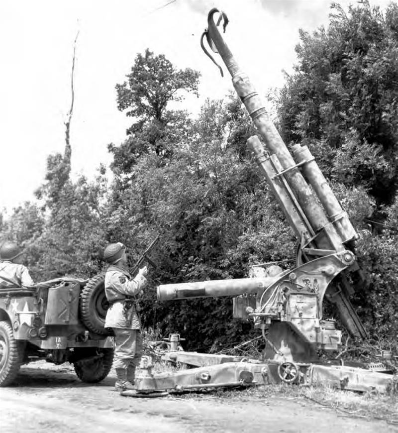 inspecting a German 88mm anti-aircraft artillery piece abandoned on the