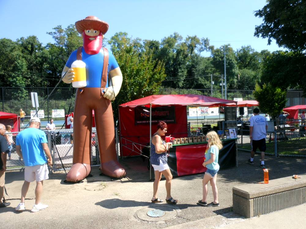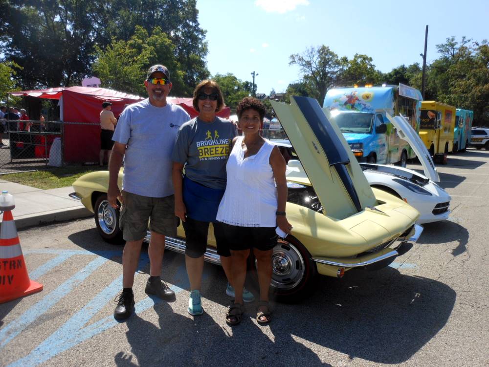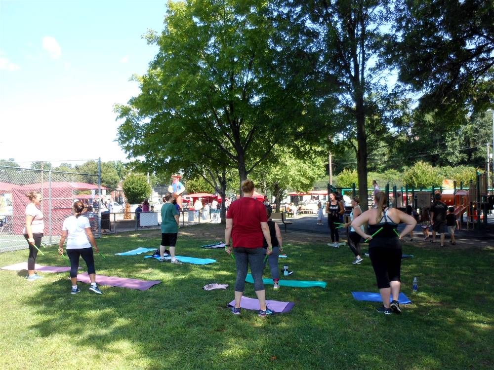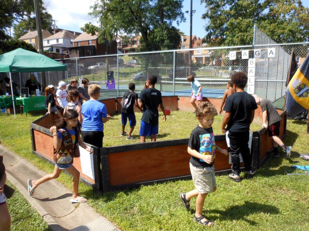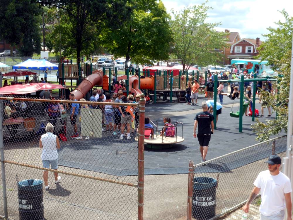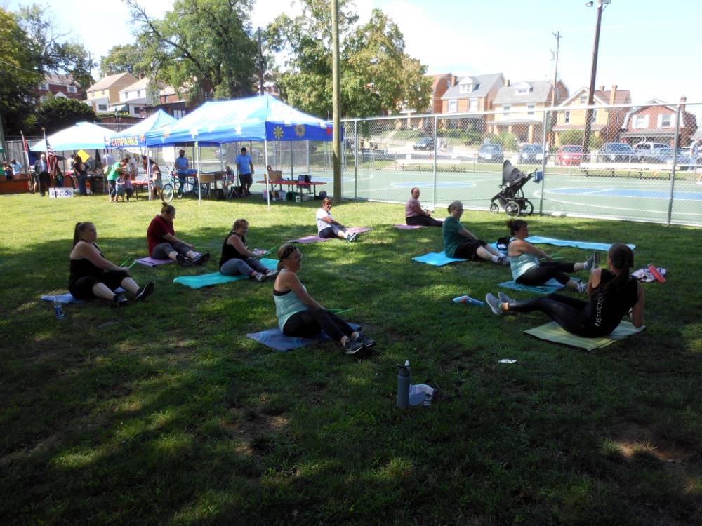 For the kids there was a Ga Ga Ball pit, the Citiparks Roving Art Cart, free admission to the pool, merchandise giveaways, the playground attractions, sprinklers and other craft booths hosted by Boy Scout Troop #6 and Girl Scout Troops #52545 and #52745. The swing sets, merry-go-round and sliding boards hadn't seen so much activity in many, many years. Adults were treated to a classic car exhibition that featured everything from a Lamborghini and Mazerati to a 1948 Oldsmobile convertible. Yoga classes were conducted on the grass by Amarah Studio and Boutique. Cartoon Anth was on hand to create personalized caricatures and illustrations. There were also merchandise booths, including artist Dino Guarino selling Moore Park Alumni shirts, and plenty of food vendors. A banner was hung by the Parks Conservancy/Brookline Connection information booth for everyone to sign.