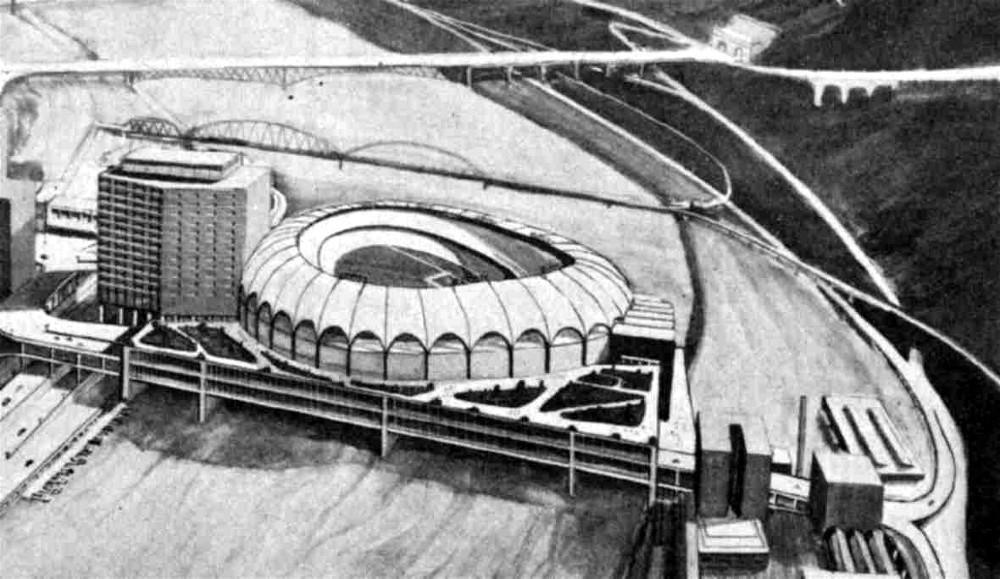 Route 51 - Liberty Tunnels Interchange? In 1957, this plan for a proposed realignment of the interchange at West Liberty Avenue and Route 51 (Saw Mill Run) at the Liberty Tunnels was highly recommended and very close to becoming a reality. Even then the traffic congestion at this busy intersection was stifling. Beginning near Bausman Street, thru-traffic would have been re-routed onto the south face of Mount Washington, over the Liberty Tunnels southern portal, and ending at Warrington Avenue. The plans had been approved, but for some reason they were put on hold for three years, then shelved completely. The heavily trafficked intersection was finally redone in 1999, and the reconfiguration was a grand improvement over what was once a traffic nightmare. Whether the above plans above would have been better is anybody's guess, but if implemented they would have saved motorists another forty years of frustration. A New Pittsburgh Sports Stadium? In 1958, this plan for a proposed new sports stadium, to replace Forbes Field, received the endorsements of several city officials and other local dignitaries. If built, it would have become the home of the Pittsburgh Pirates and the Pittsburgh Steelers. The stadium complex would rest above the Monongahela River, and include a two-tiered parking garage and a hotel. The Smithfield Street Bridge would have been torn down and the riverfront dramatically reconfigured. Another similar design is shown below. The plans were eventually shelved, and another decade passed before the North Side groundbreaking for the new "Pittsburgh Stadium", renamed Three Rivers Stadium, in April 1968. It is, however, an interesting view of what might have been. |